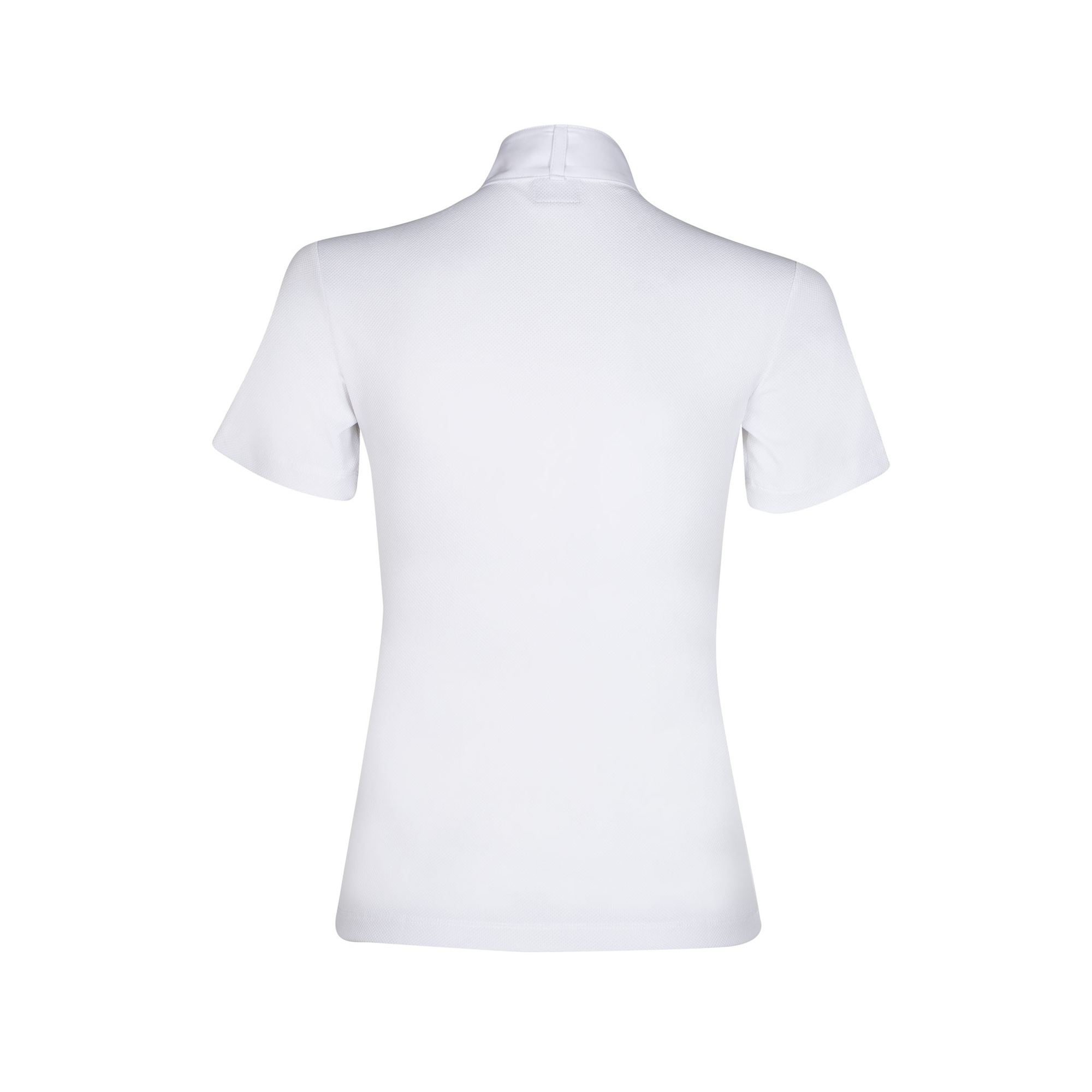 Schönes Frauen Turnier-Poloshirt mit Stehkragen aus leichtem und sehr gut sitzendem Funktionsmaterial. Sein Hauptvorteil ist der schnelle Feuchtigkeitsabtransport und eine ausreichende Luftzirkulation, wodurch das Hemd auch an heißen Tagen angenehm zu tragen ist. Es hat fünf Knöpfe. Es hat das Animo-Logo auf Brust und Stehkragen und das Equishop Team-Logo auf der anderen Seite des Stehkragens.