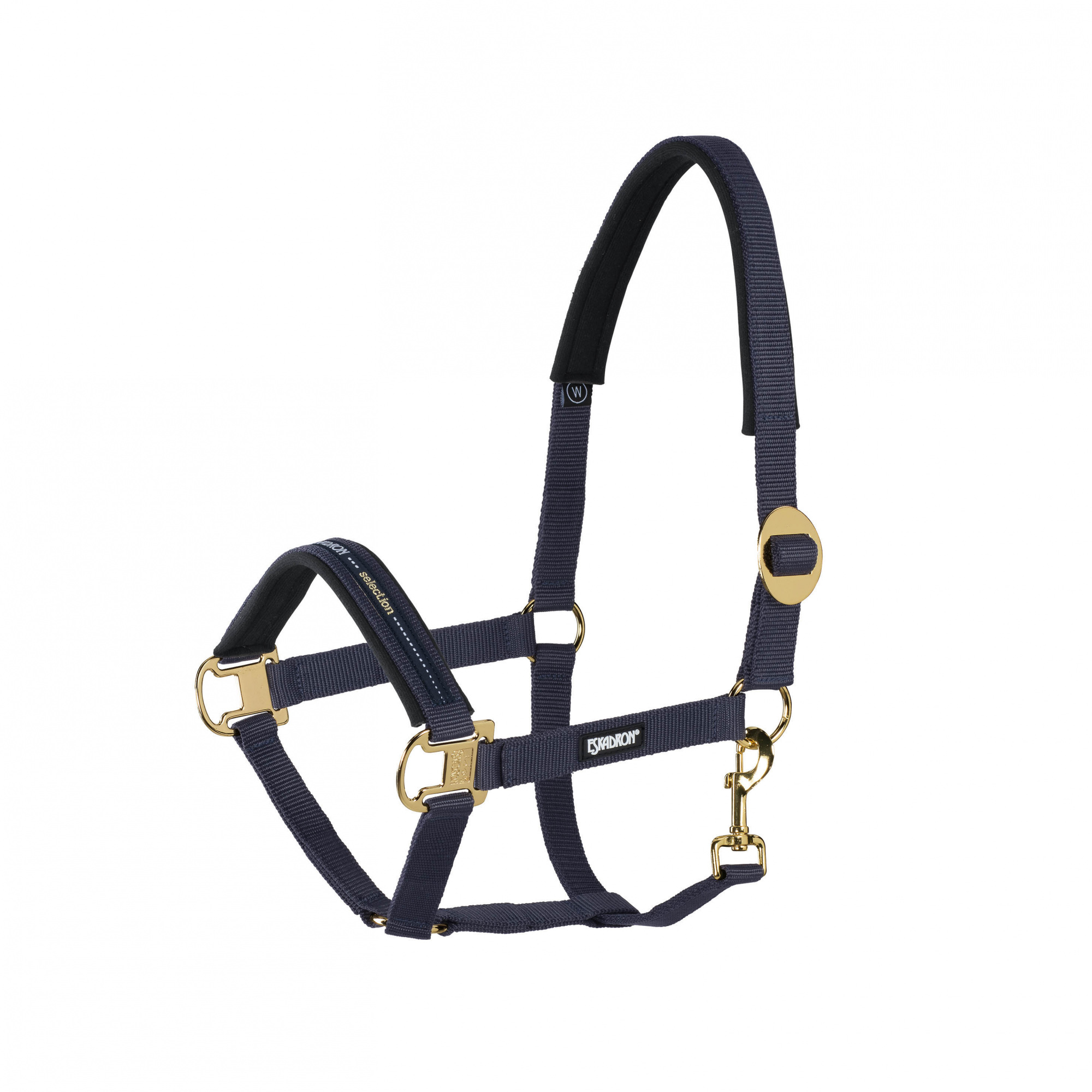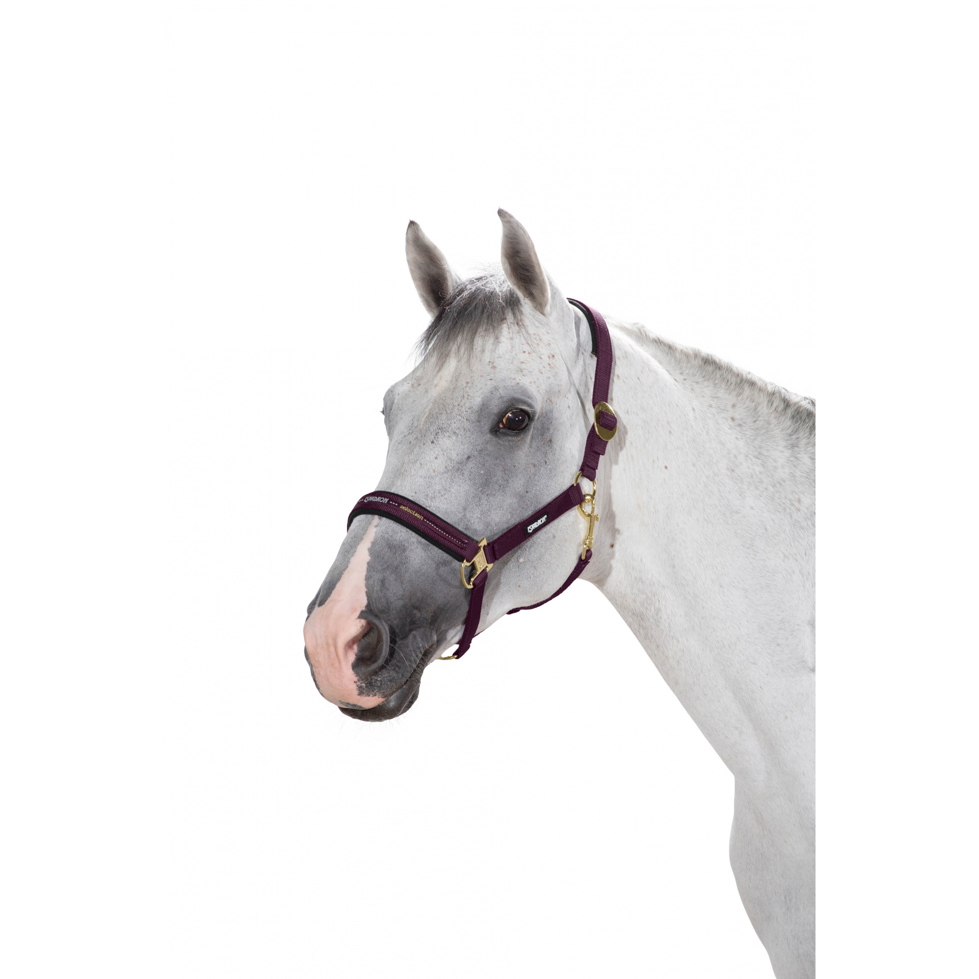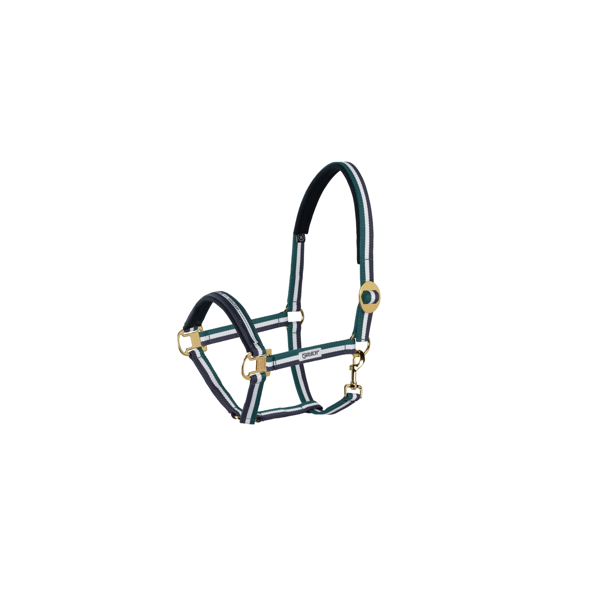 Das Halfter besteht aus starkem, doppelt vernähtem Gurtband, das reißfest ist. Die Nasen- und Hinterteile sind mit einem weichen Stoff ausgekleidet, um ein Scheuern zu verhindern. Das Halfter wird mit einer verschiebbaren Klammer befestigt, die auch eine gute Anpassung und Einstellung an den Pferdekopf ermöglicht. Es hat goldfarbene Metallbeschläge. Es ist in verschiedenen Farben und Größen erhältlich.