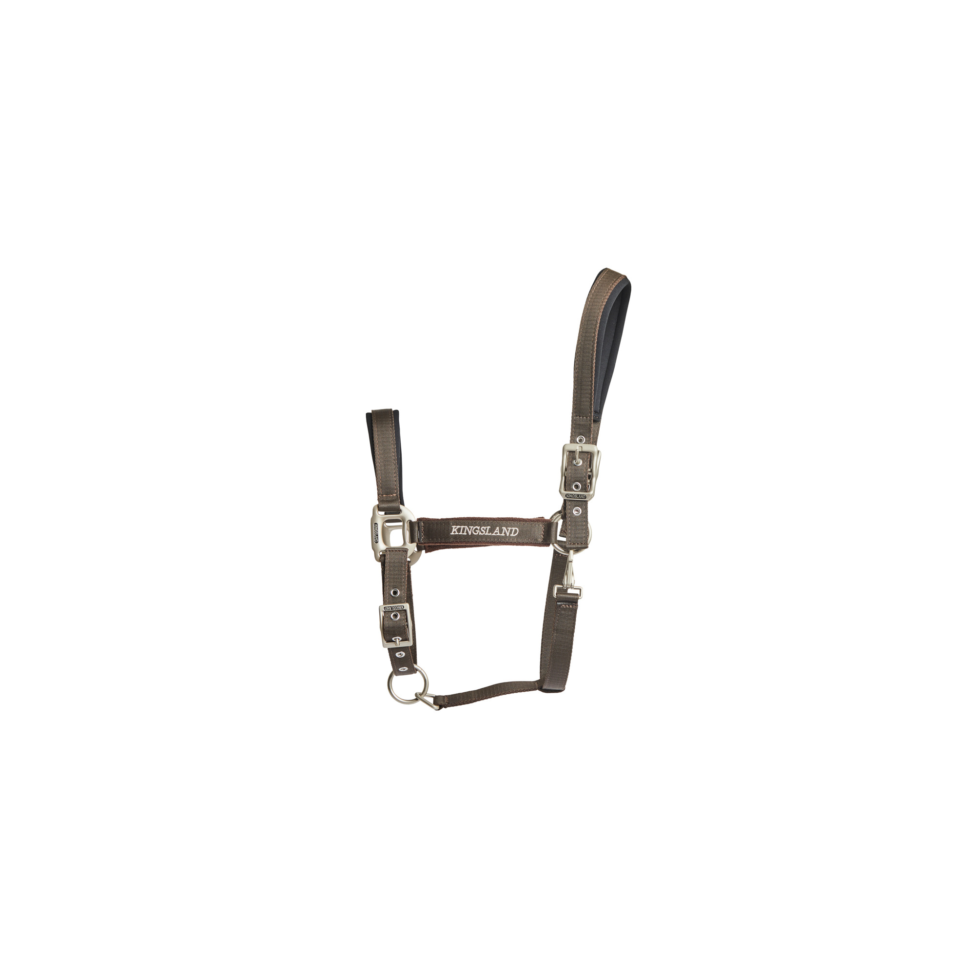 Das Halfter besteht aus dickem Band, das strapazierfähig und leicht zu reinigen ist. Das Halfter hat helle, haltbare Beschläge und eine breite Einstellung an zwei Stellen: am Hinterkopf und am Nasenteil. Das Kingsland-Logo ist auf dem Nasenriemen und an der Seite aufgestickt.