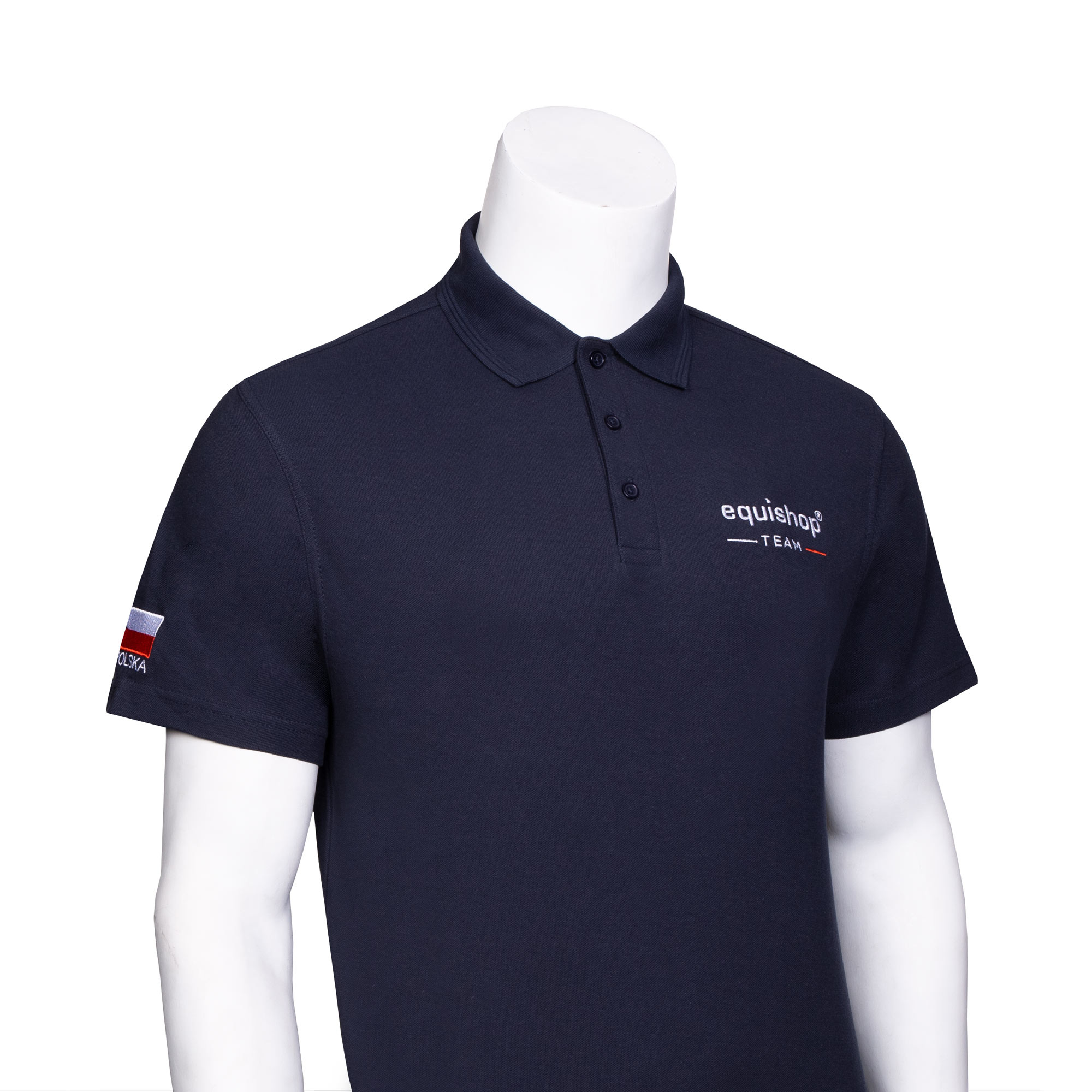 Reithemd für Herren mit dem Equishop Team-Logo. Es wurde aus sehr hochwertigem Material angefertigt, das sich durch gute Luftdurchlässigkeit, Flexibilität und Komfort für die Haut auszeichnet. Es ist mit kurzen Ärmeln, drei Knöpfen mit Polokragen und einer kleinen Öffnung am Ende des Hemdes an der Seite ausgestattet. Das Hemd eignet sich sowohl für den täglichen Reitsport als auch für Reitwettbewerbe. Auf der Schulter befindet sich eine dekorative Stickerei mit der polnischen Flagge und auf der Brust auch eine Stickerei mit dem Logo des Equishop-Teams.