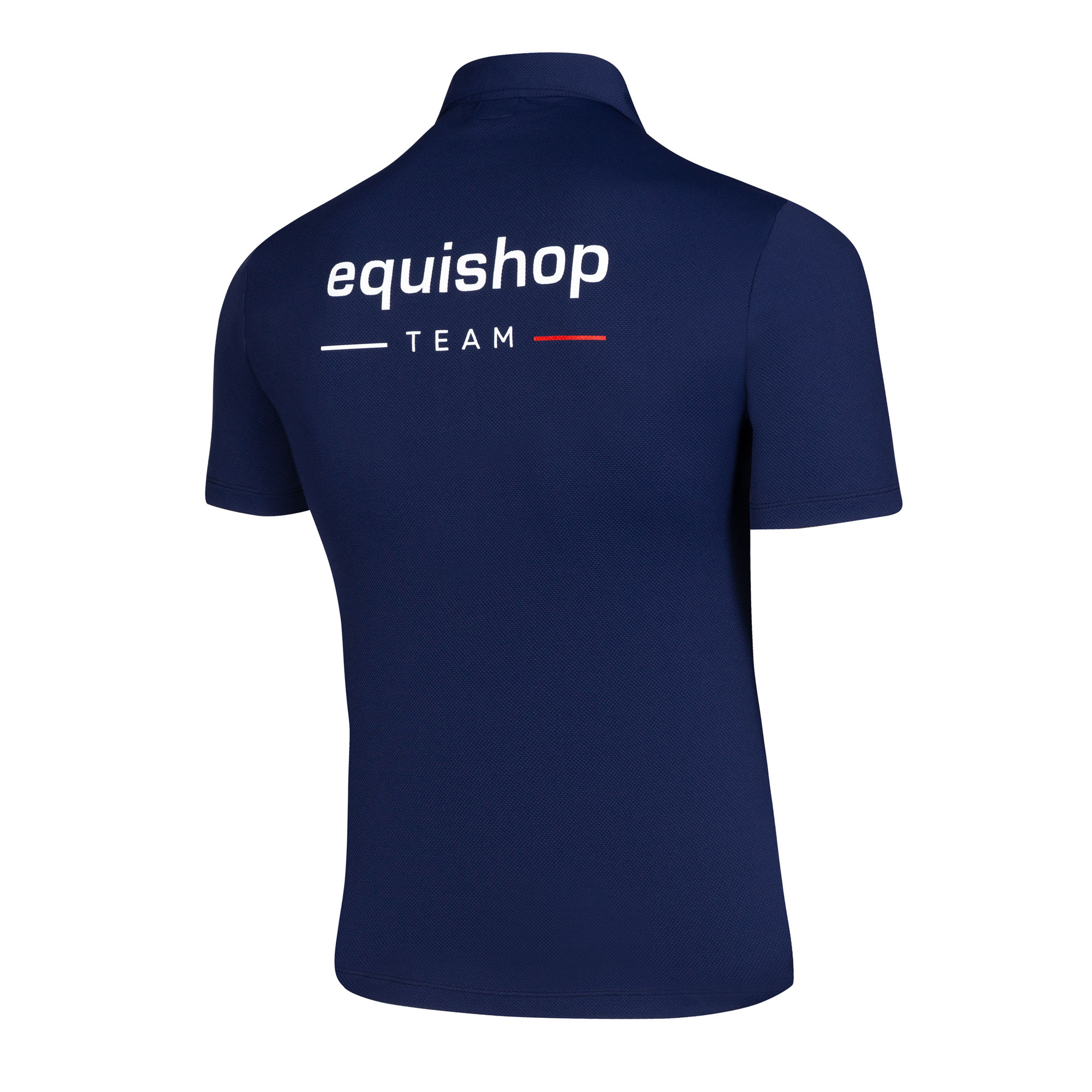 Herren-Reit-T-Shirt mit dem Equishop Team by Animo-Logo. Es wurde aus einem sehr hochwertigen Material angefertigt, das für eine sehr gute Luftzirkulation sorgt, flexibel ist und einen sehr hohen persönlichen Komfort garantiert. Das T-Shirt ist mit kurzen Ärmeln ausgestattet, was es perfekt zum Reiten an Sommertagen macht, und hat auch einen Halsverschluss mit vier kleinen Knöpfen mit Polokragen. Es hat dekorative Stickerei mit dem Equishop Team-Logo auf der rechten Brustseite und eine Stickerei mit dem Animo-Logo auf der linken Seite.
