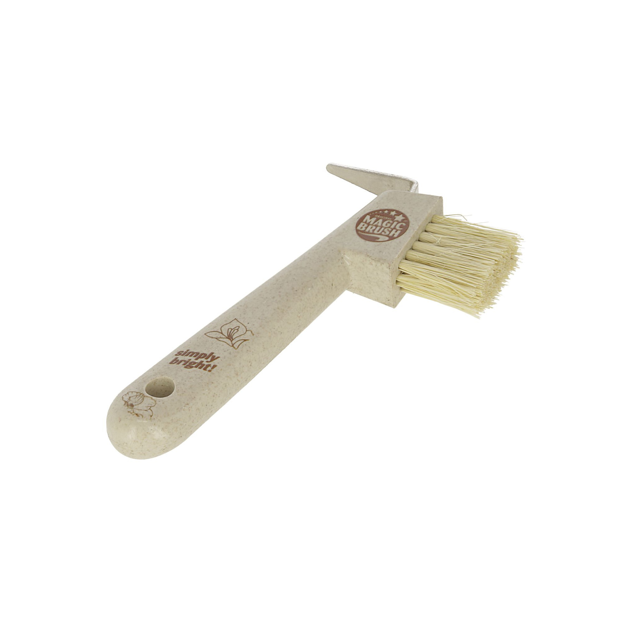 Pferdehufkratzer von Magic Brush. Er besteht aus hochwertigem Kunststoff, der zu 60% aus recyceltem Material besteht. Der Kratzer ist sehr haltbar. Er hat ein Metallende zum Reinigen der Hufe und auf der anderen Seite befinden sich eine 3 cm lange Borsten. Im oberen Teil wurde eine dekorative Gravur mit dem Magic Brush-Logo und im unteren Teil eine Seerose hinzugefügt.