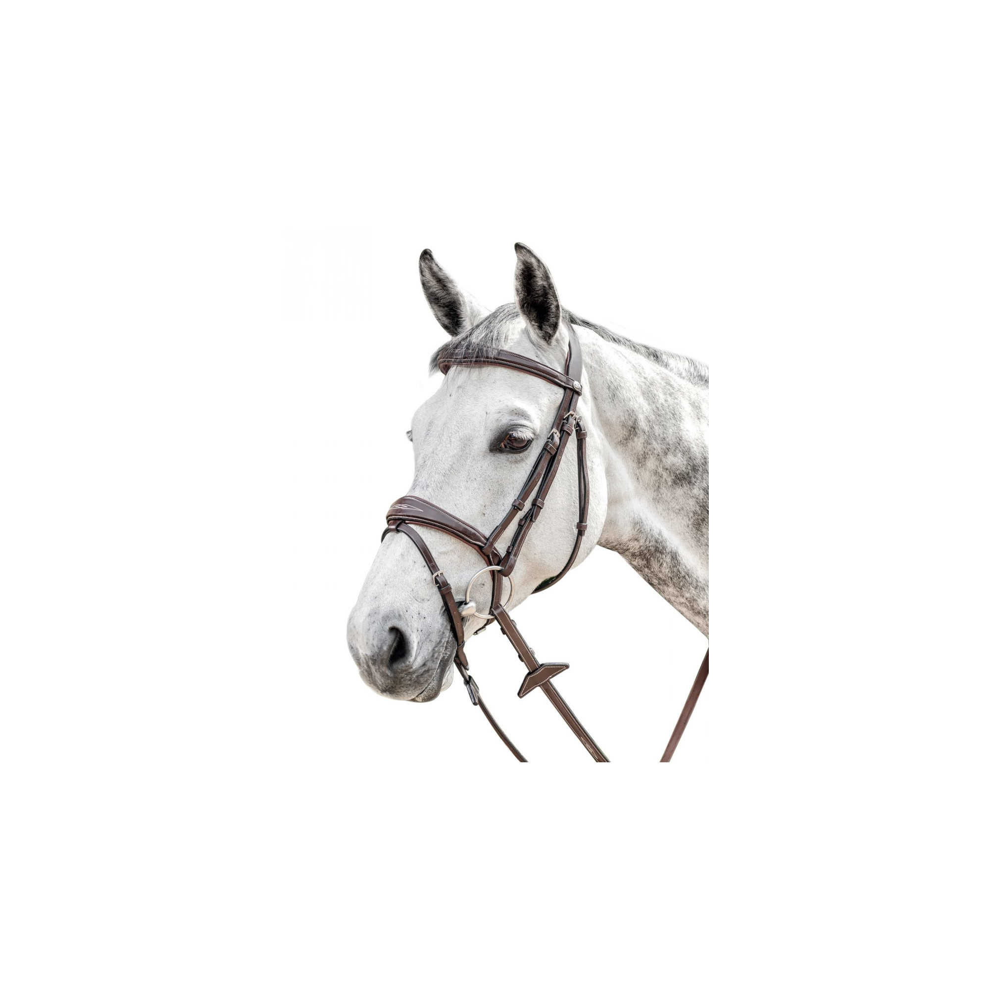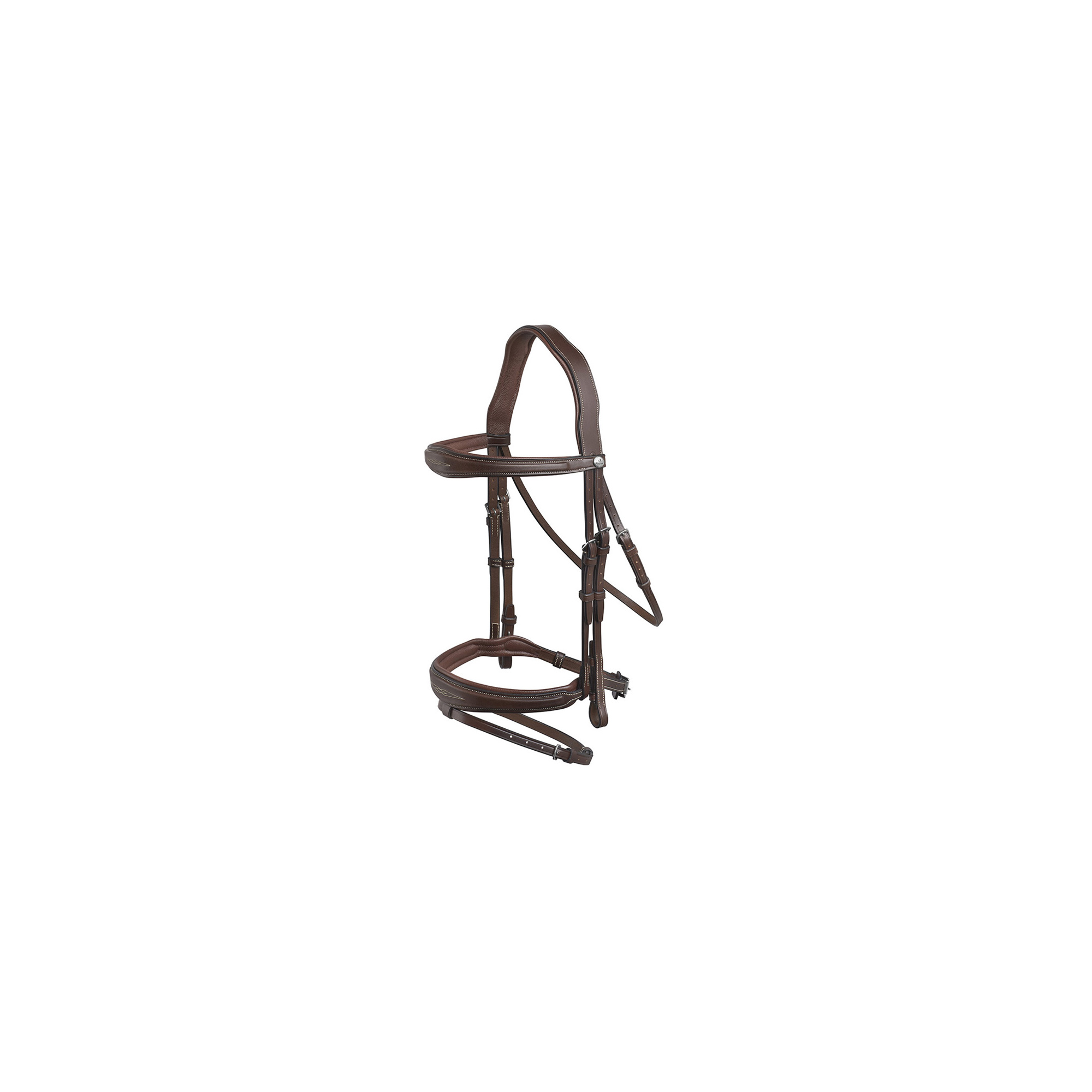 Ein sehr effektvolles und elegantes englisches Zaumzeug. Es wurde aus hochwertigem Rindsleder hergestellt. Nasenriemen, Stirnriemen und Genickriemen sind weich gefüttert, um den Druck zu minimieren. Es ist mit Nähten in Kontrastfarbe verziert. Die Beschläge sind aus Edelstahl. Der Nasenrimen ist im englischen Stil mit einem kombinierten Riemen.