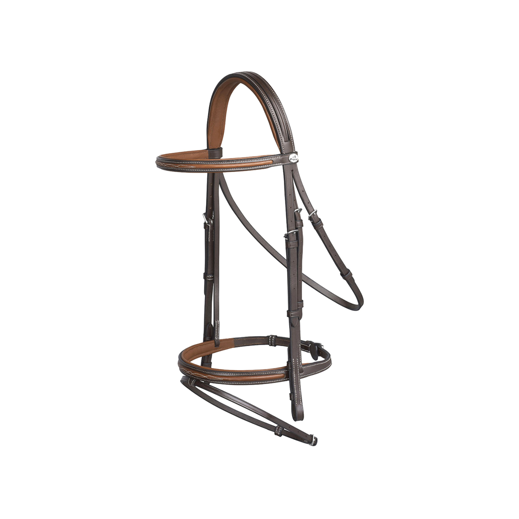 Feine englische Trense mit einfacher Bombierung und weicher Lederpolsterung. Das Reithalfter geht in das Innere des Genickstücks über, um besser eingestellt werden zu können. Die Trense ist fein verziert mit Kontrastnähten, Stirnriemen und Reithalfter besitzen elegante Ledereinsätze. Zur Auswahl mit Baumwollzügeln mit 5 Stoppern (E89) oder Gummizügeln (E90), die jeweils mit einem eleganten Einsatz aus weichem Leder und kontrastierenden Nähten verziert sind.