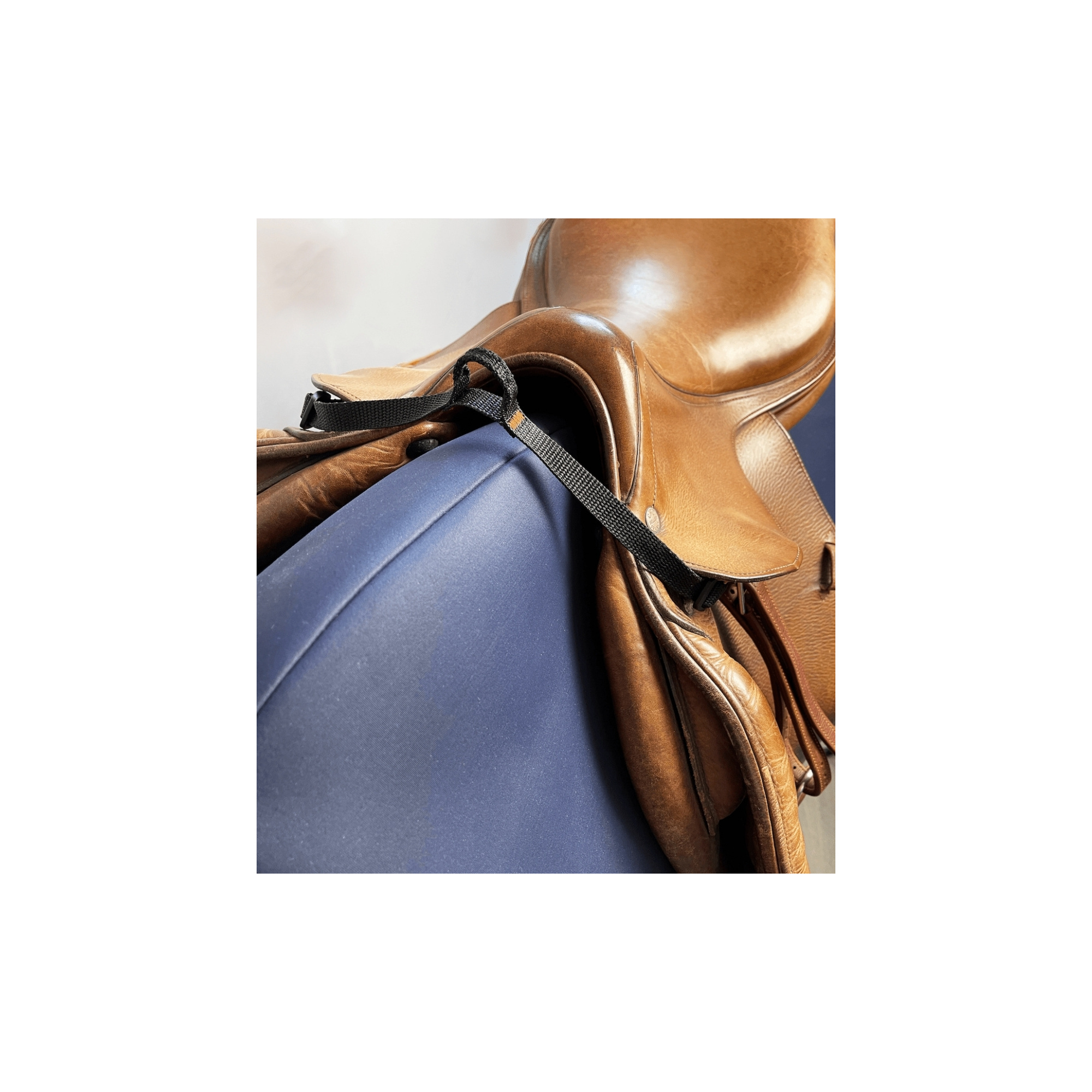 Befestigungsriemen speziell für die Freejump Airbagweste. Um einen ordnungsgemäßen Schutz und Gebrauch der Weste zu sichern, sollte der Gurt gemäß den Anweisungen am Sattel montiert und in seiner Länge entsprechend angepasst werden. Der Karabiner der Leine muss vor jedem Training am Riemen befestigt werden.