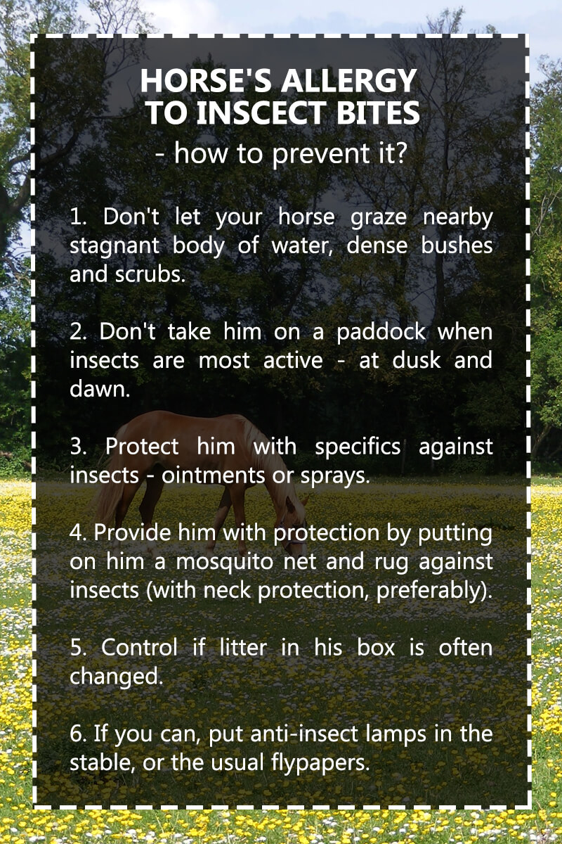 However, if the symptoms of allergy have already appeared, you can help your horse by using the appropriate preparations - soothing the effects of insect bites. If you don't own those designed for horses, you can use specifics designed for people, to bring your horse any relief. Of course, let's not forget that preparations for horses are much stronger than those for people, so it is worth to spend some more money to provide your horse with much better comfort.