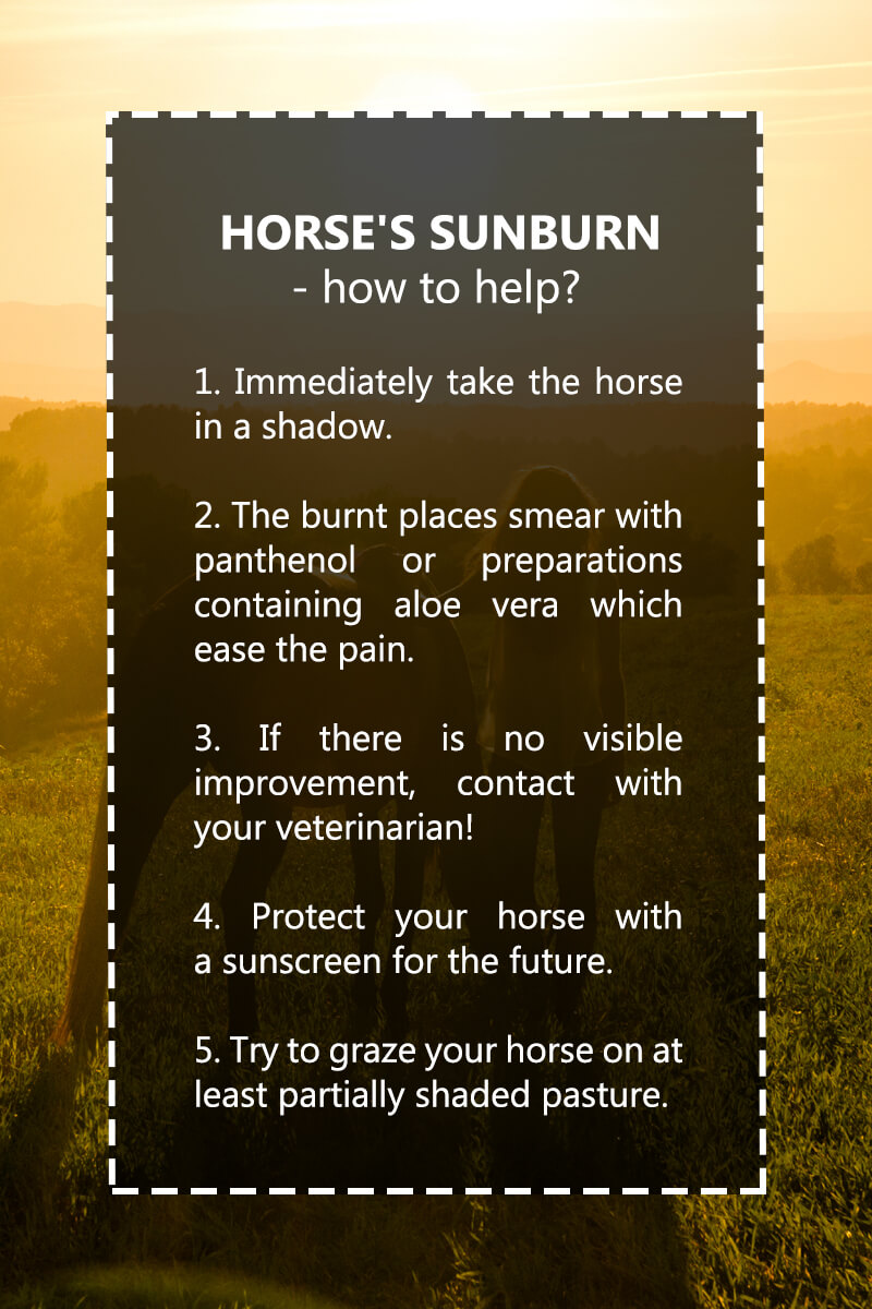The most vulnerable to its exposure are the horses with lack of pigment in their skin, especially on the head (nearby ears, muzzle) and limbs. Excessive exposure to the sunlight might cause reddening, swelling, touch sensitivity, blisters, erosions, and weeping. In order to avoid these problems, it is worth to apply sunscreen with high UV protection on horses with white skin.