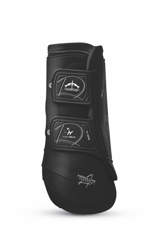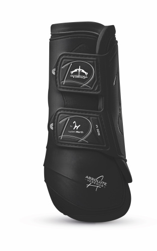 On the left side there is a Veredus Absolute dressage boot with stud fastening, whereas on the right side there is a velcro fastening.