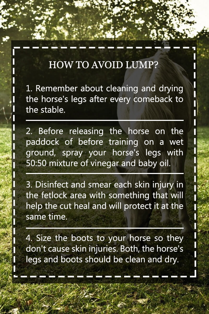 Let's remember that before you start any treatment whether natural or with preparations, you should consult a veterinarian. It's not worth to safe at our friend's health :) The fight against the lump is a long and toilsome process. Even when you think you've already cured it, it usually comes back at certain times of the year. So, it is worth to take care of our horse before infection.