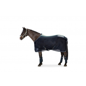 An anti-fly rug made of polyester mesh. Due to the used material it is light and airy, at the same time being very durable. There is a fastening with a buckle and velcro on the chest, cross straps on the belly, and a strap under the tail. Around the withers, it is lined with fur, which minimizes the risk of chafing. There is a thicker, also airy material on the back. The rug is decorated with an Eskadron inscription.