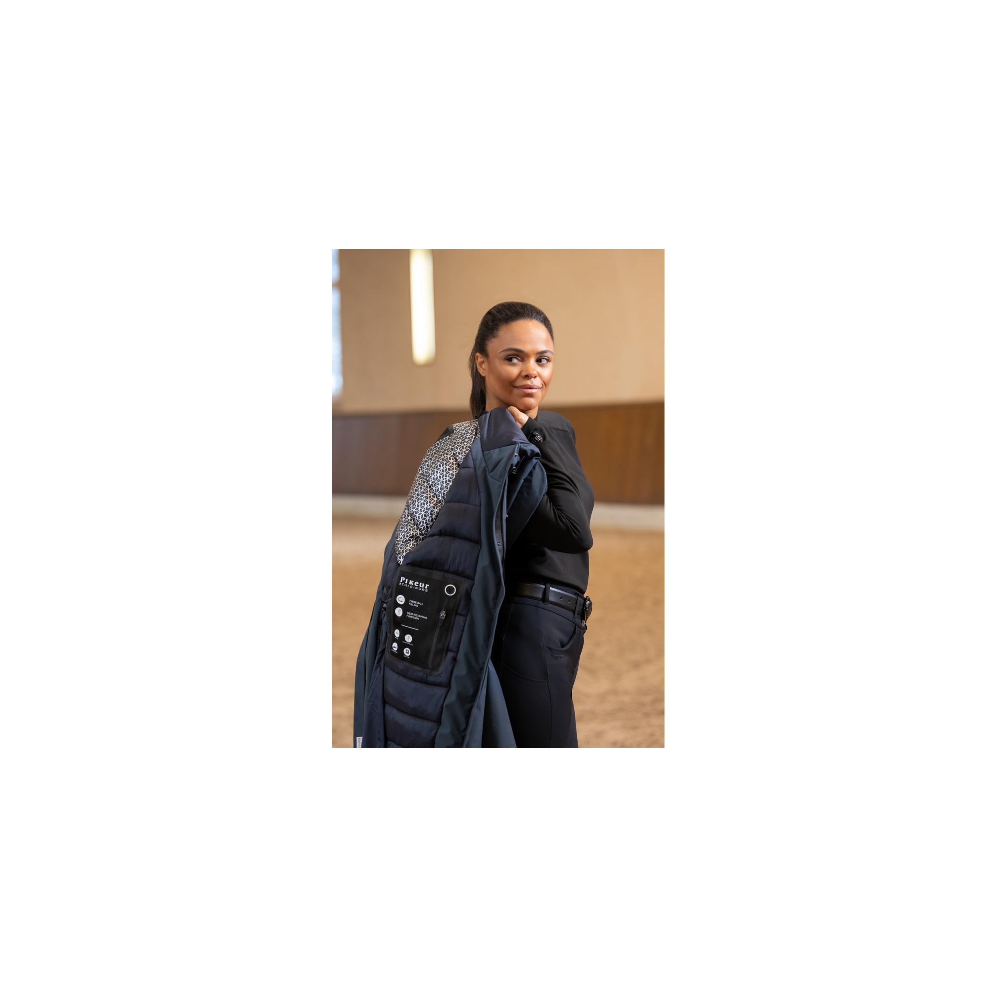 The tailored feminine cut highlights the silhouette, while the extended length effectively covers the legs and saddle area during riding. Special riding slits and inserts provide full freedom of movement in the saddle while maintaining complete rain protection. The Athleisure collection combines modern style with high functionality, making this coat ideal for both training sessions and everyday wear.