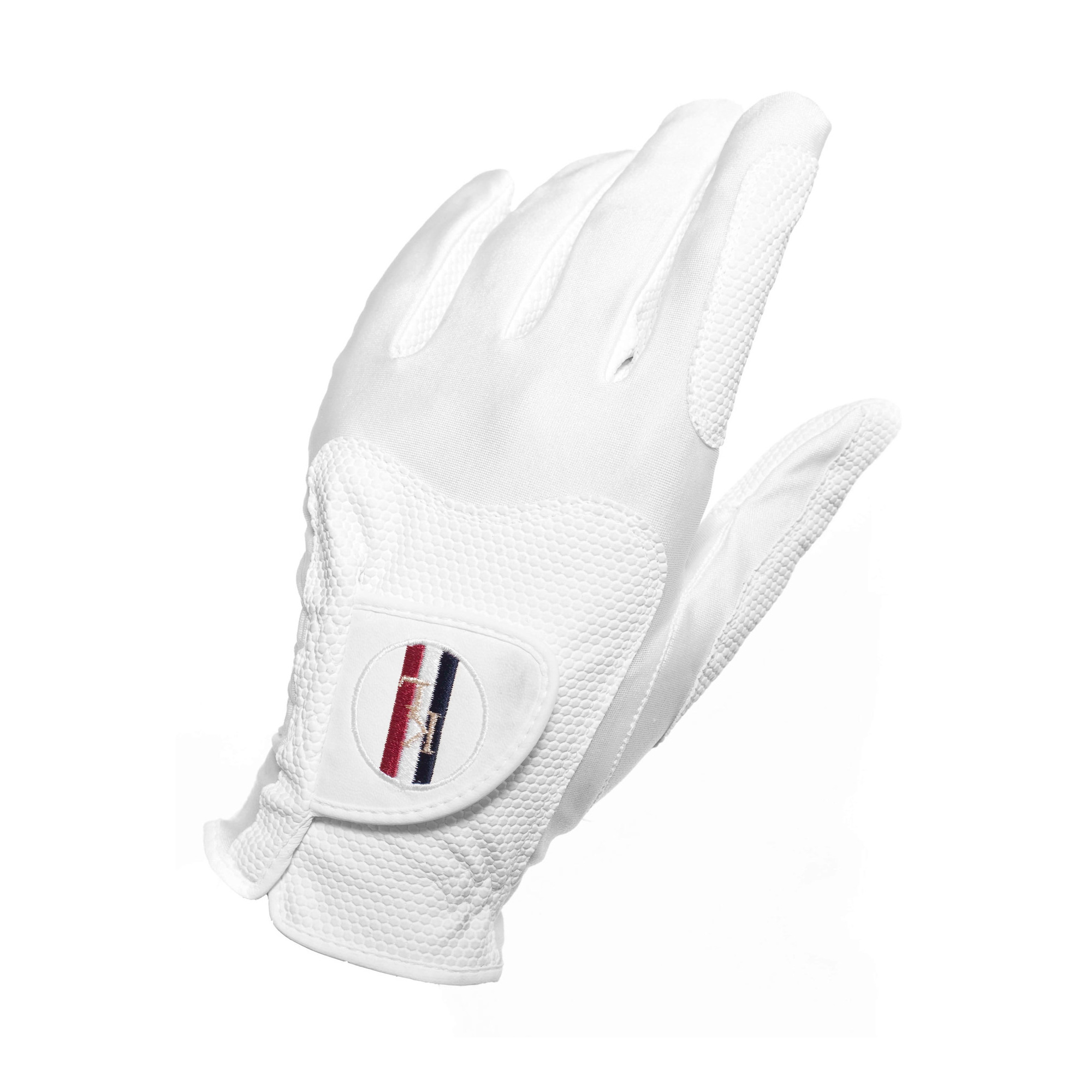 Rękawiczki jeździeckie firmy Kigsland w kolorze białym przeznaczone na zwody jeździeckie. Zostały wykonane z lekkiego i elastycznego materiału, który zapewnia dobrą przepuszczalność powietrza. Rękawiczki zostały wyposażone w zapięcie na szeroki rzep oraz wzmocnienie po wewnętrznej stronie dłoni, który zapewnia dobrą przyczepność do wodzy. Dodatkowo na zapięciu dodano duży haft z logo firmy Kingsland. Ten model rękawiczek jeździeckich doskonale nadaje się na zawody jeździeckie bądź do codziennej jazdy konnej.