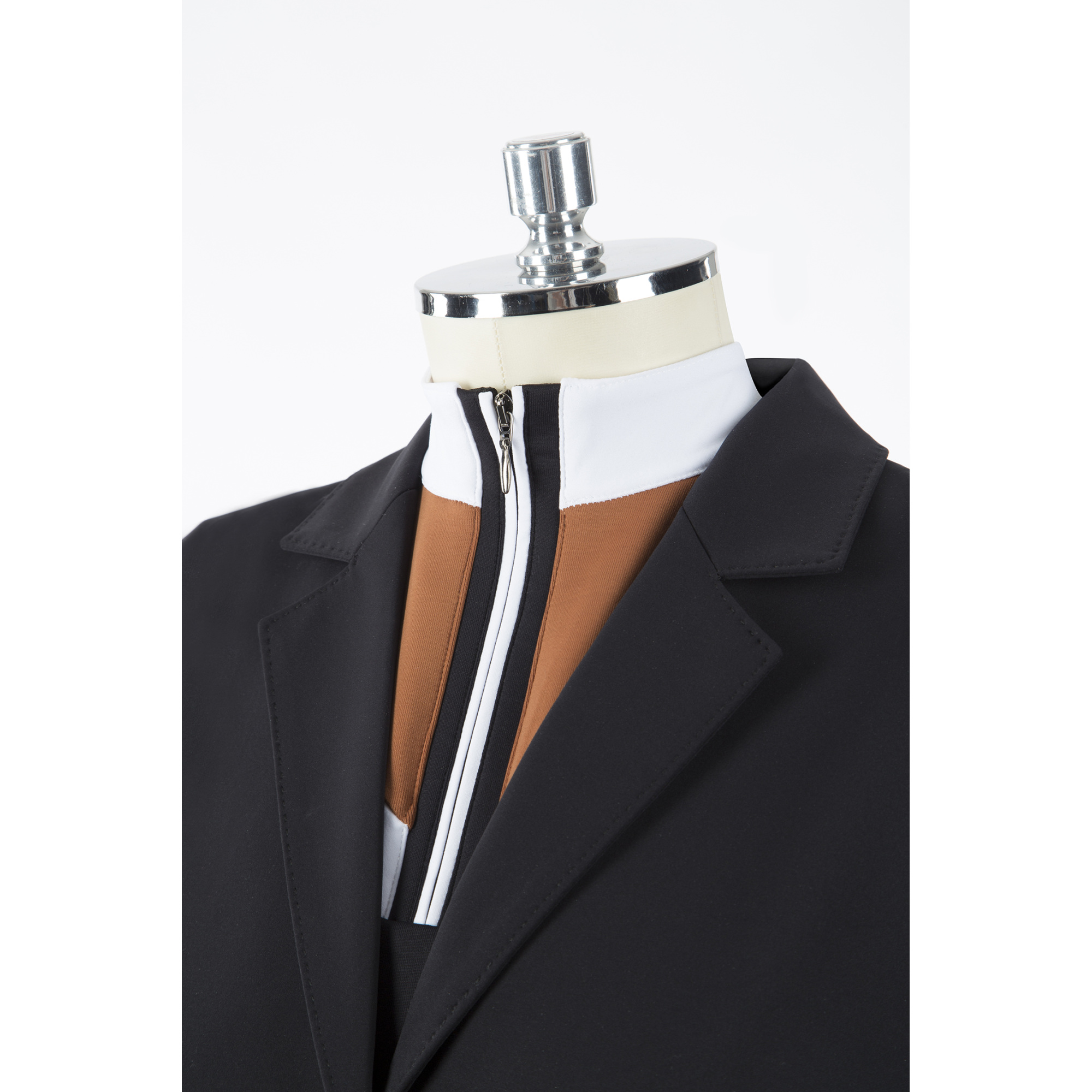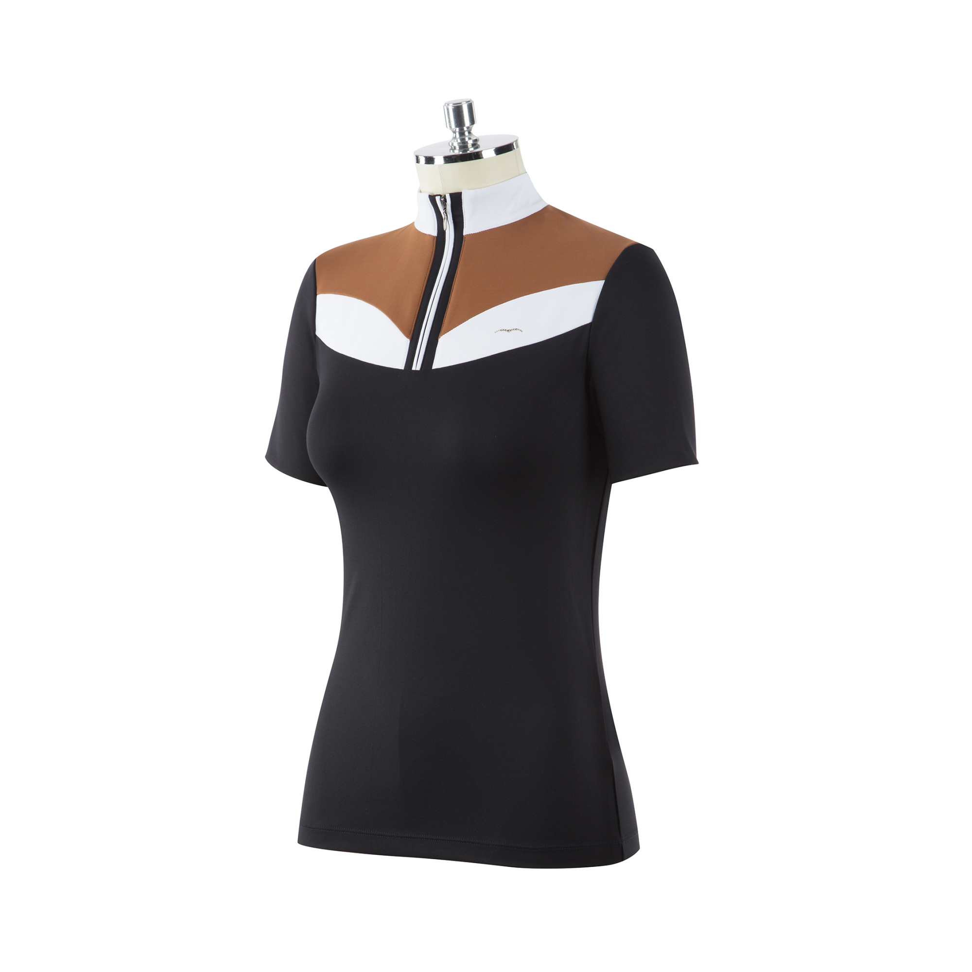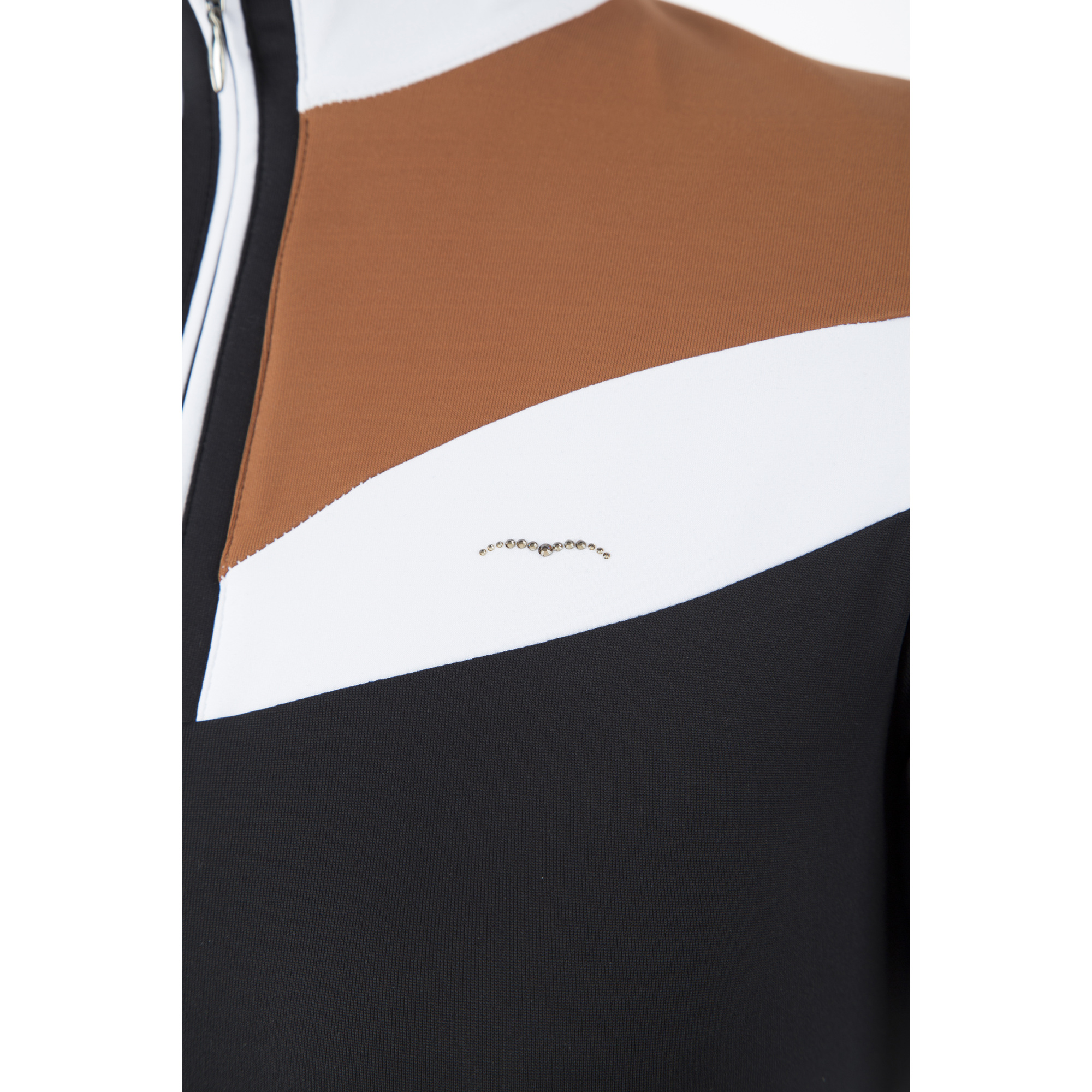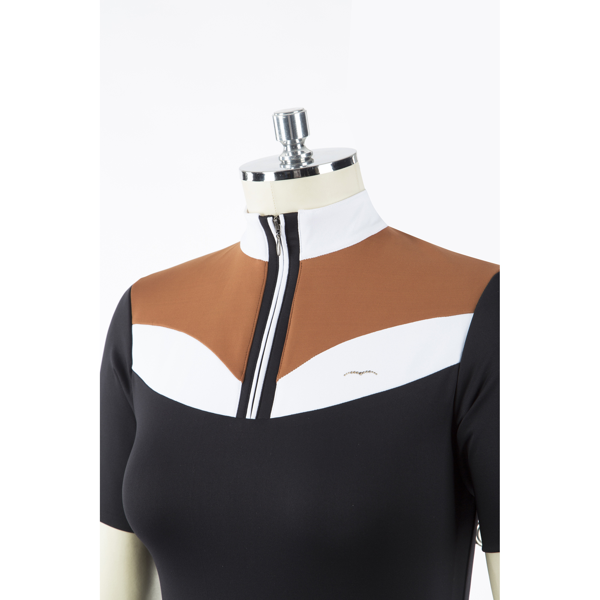 A póló nagyon érdekes kialakítású, amely zakó alatt és anélkül is nagyszerűen mutat. A póló szabása kiemeli a női alak előnyeit. Az állógallér kényelmes és szépen elrejtett cipzárral lehet rögzíteni. A mellkason egy kis Animo logó található, amely kristályokkal van kirakva.