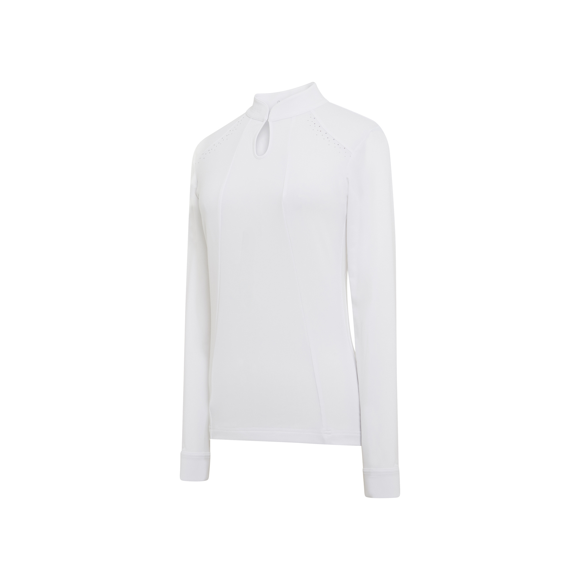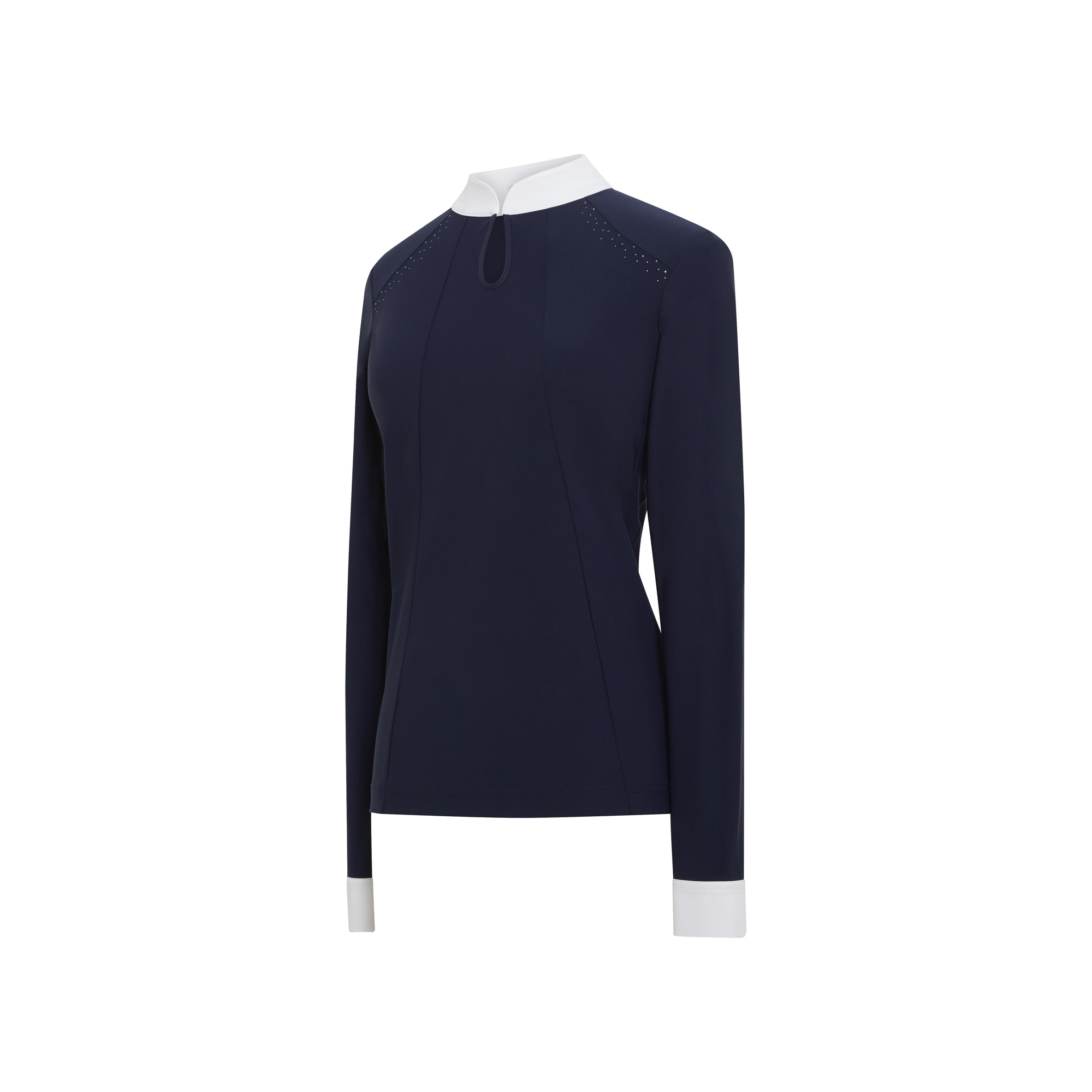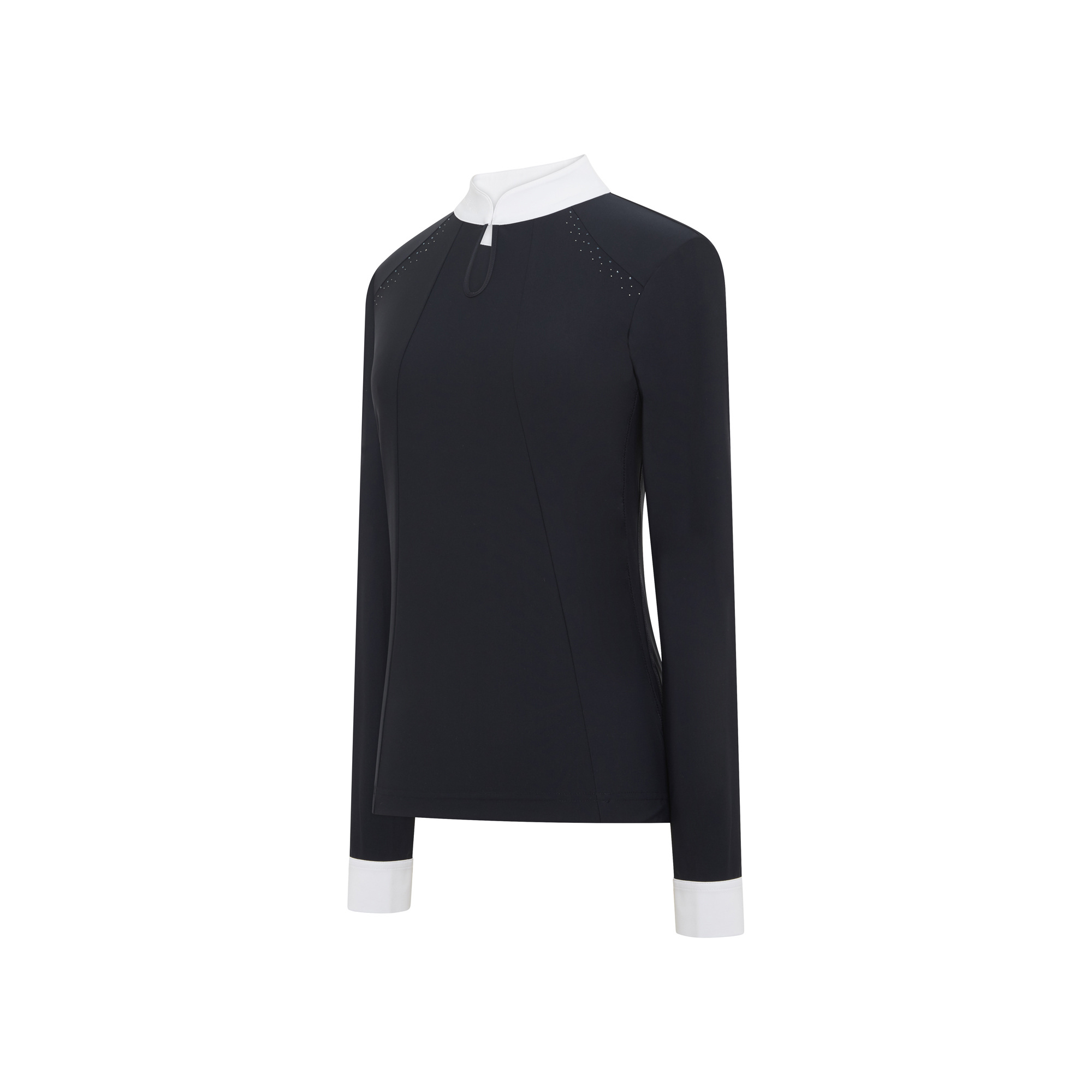 Az Elvira női hosszú ujjú versenypóló két francia szövetből áll: egy 4 irányban nyúló, technikai sztreccs anyagból az elején és egy lurex anyagból a hátán és az oldalán. Anyaga mozgásszabadságot és teljes kényelmet biztosít - légáteresztő illetve elvezeti a felesleges nedvességet. A póló gyönyörűen kidolgozott részletekkel hívja fel magára a figyelmet: elől könnycsepp alakú mintában végződő gallérral és Swarovski kristályokkal, amelyek finoman díszítik a kulcscsont öltésvonalát. A póló mosógépben 30 fokon mosható. Ez egy kiváló minőségű modell, amely professzionális megjelenést és kifogástalan összképet biztosít a verseny során.