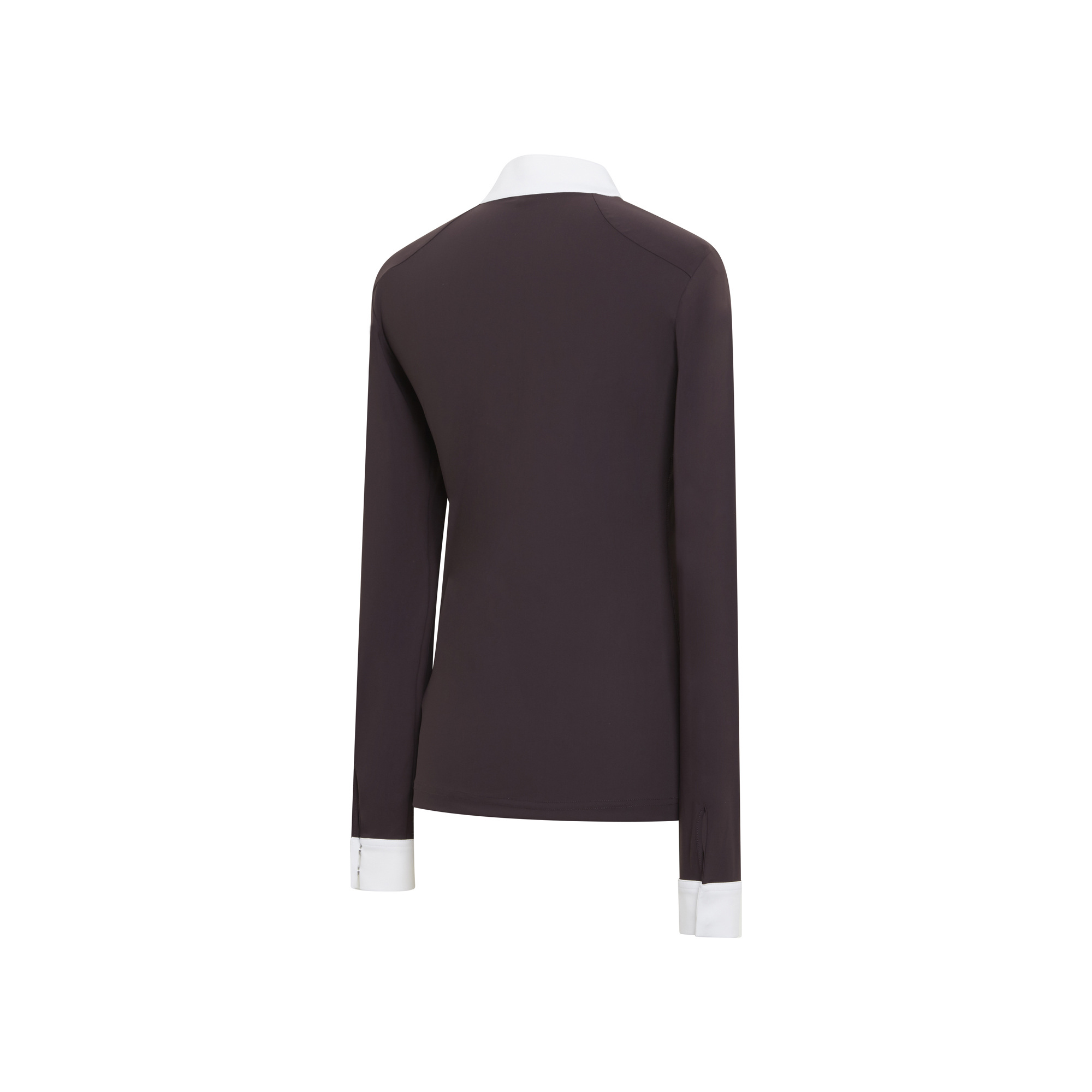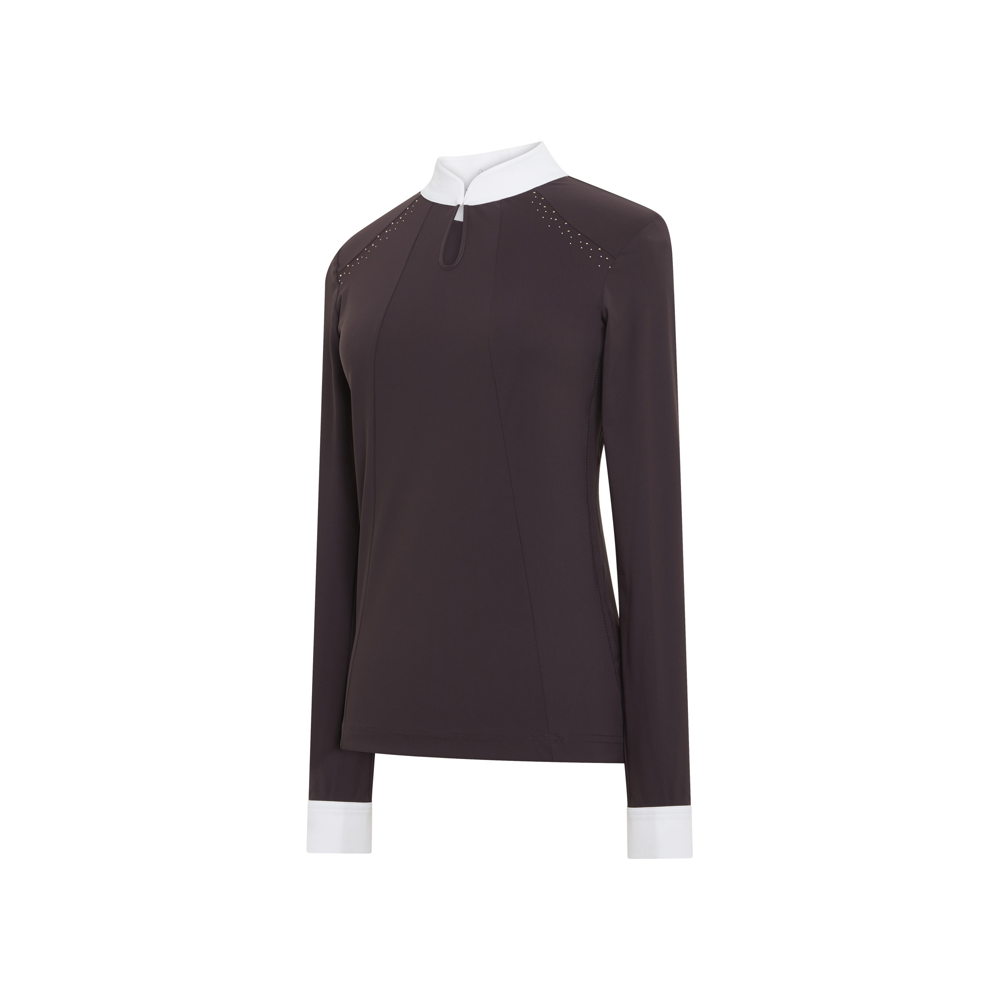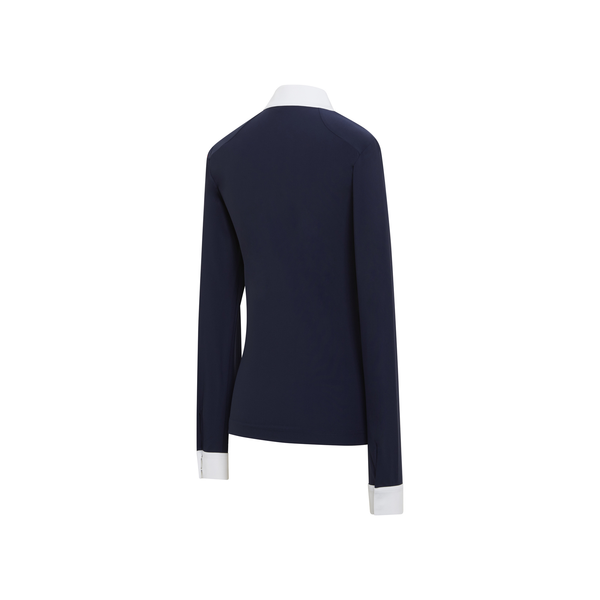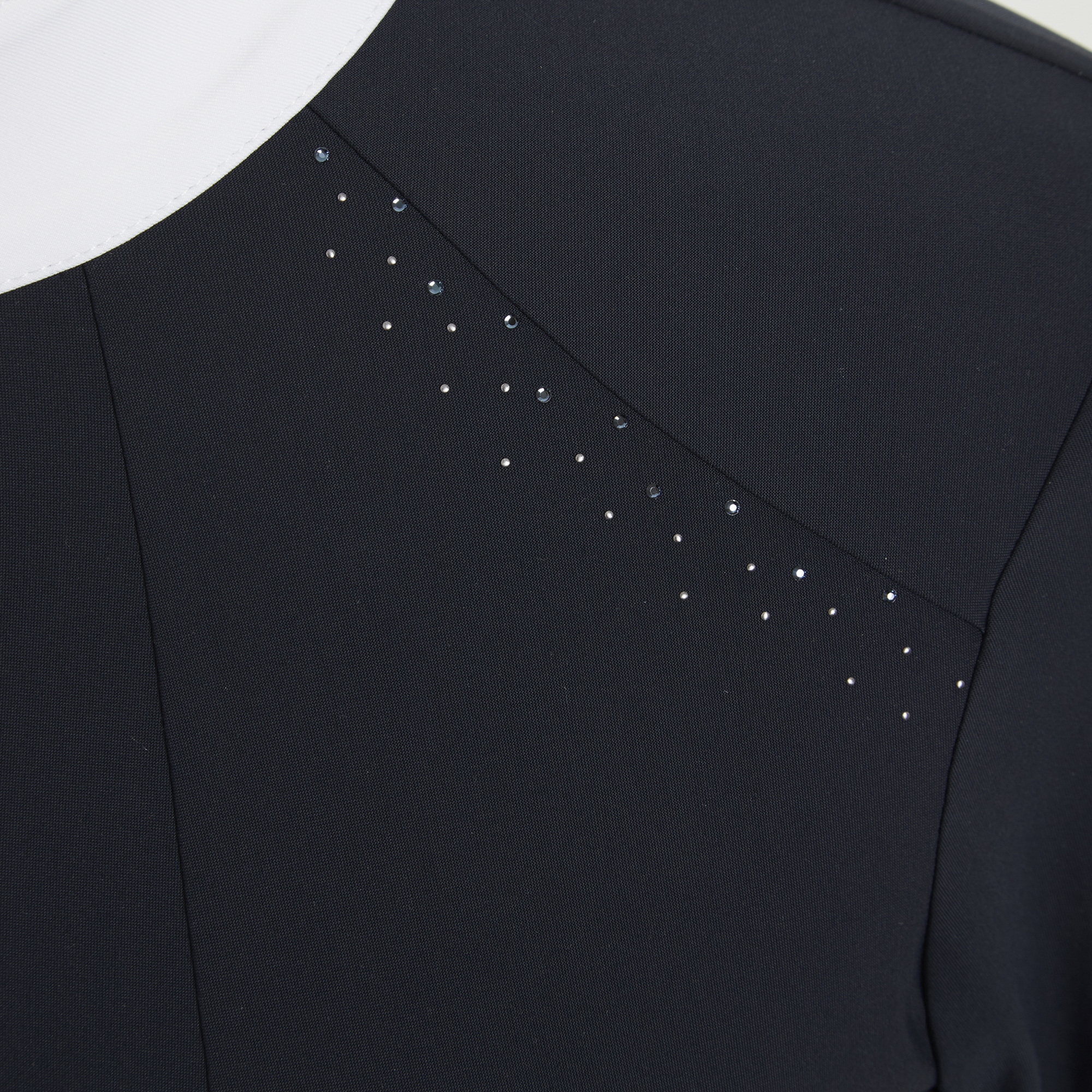 Az Elvira női hosszú ujjú versenypóló két francia szövetből áll: egy 4 irányban nyúló, technikai sztreccs anyagból az elején és egy lurex anyagból a hátán és az oldalán. Anyaga mozgásszabadságot és teljes kényelmet biztosít - légáteresztő illetve elvezeti a felesleges nedvességet. A póló gyönyörűen kidolgozott részletekkel hívja fel magára a figyelmet: elől könnycsepp alakú mintában végződő gallérral és Swarovski kristályokkal, amelyek finoman díszítik a kulcscsont öltésvonalát. A póló mosógépben 30 fokon mosható. Ez egy kiváló minőségű modell, amely professzionális megjelenést és kifogástalan összképet biztosít a verseny során.