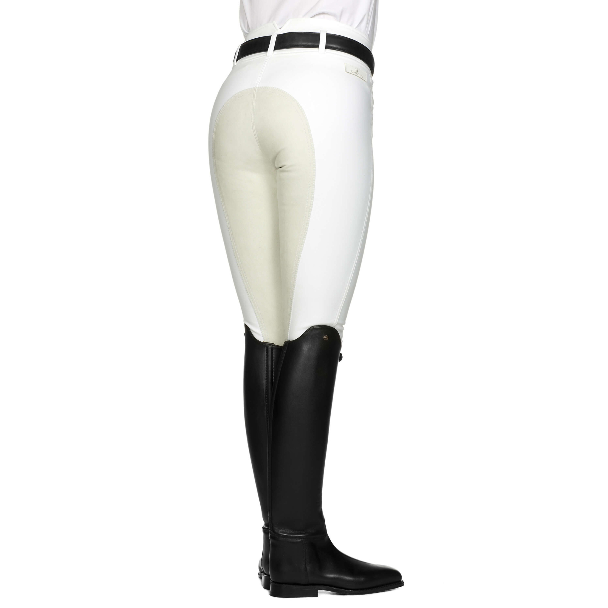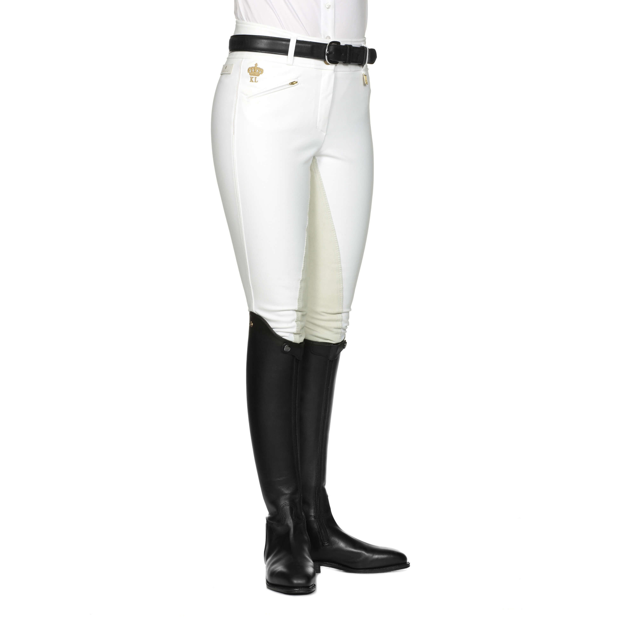 Damskie bryczesy konkursowe z wysokim stanem, odpowiednie do fraka ujeżdżeniowego. Posiadają pełny lej ze skóry Clarino, dół nogawki wykończony jest tkaniną z lycrą. Bryczesy ozdobione są złotymi guziczkami, nitami, skórzaną naszywką z tyłu, haftem z wkomponowanymi kryształkami Swarovskiego.