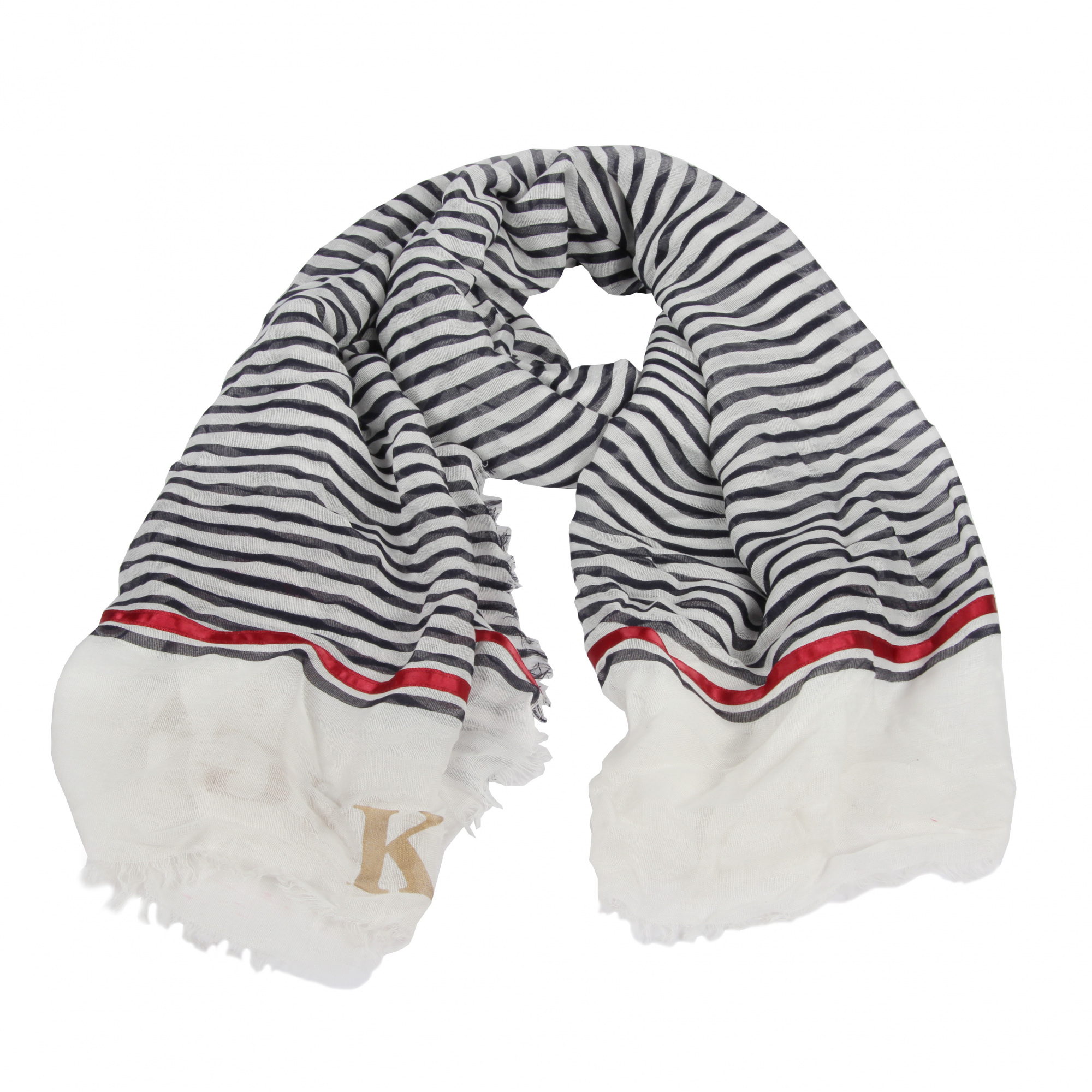 Piękny damski szalik Kingsland z nadrukiem z paseczków. Ozdobiony jedwabną lamówką w kontrastowym kolorze. Nadrukowane logo Kingsland. Dostępny w dwóch wersjach kolorystycznych – granat / biały z czerwoną lamówką i róż / biały z granatową lamówką. Można prać w pralce w 30 stopniach.