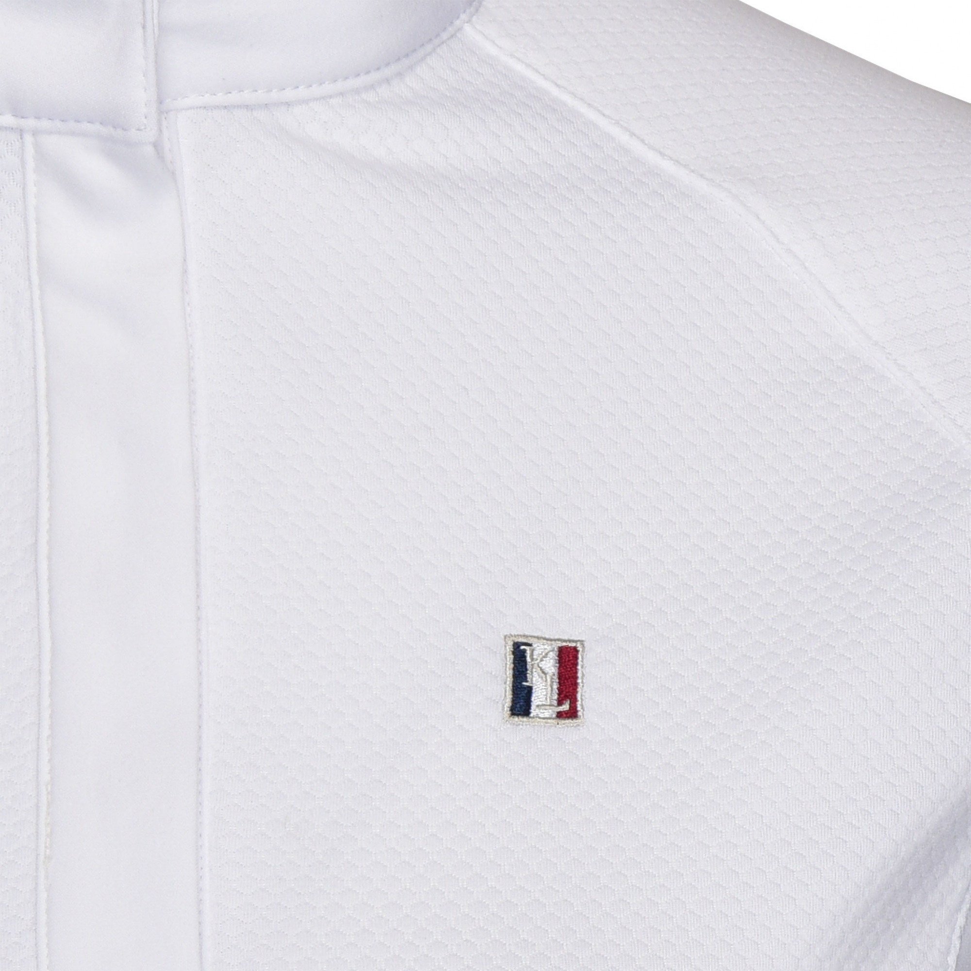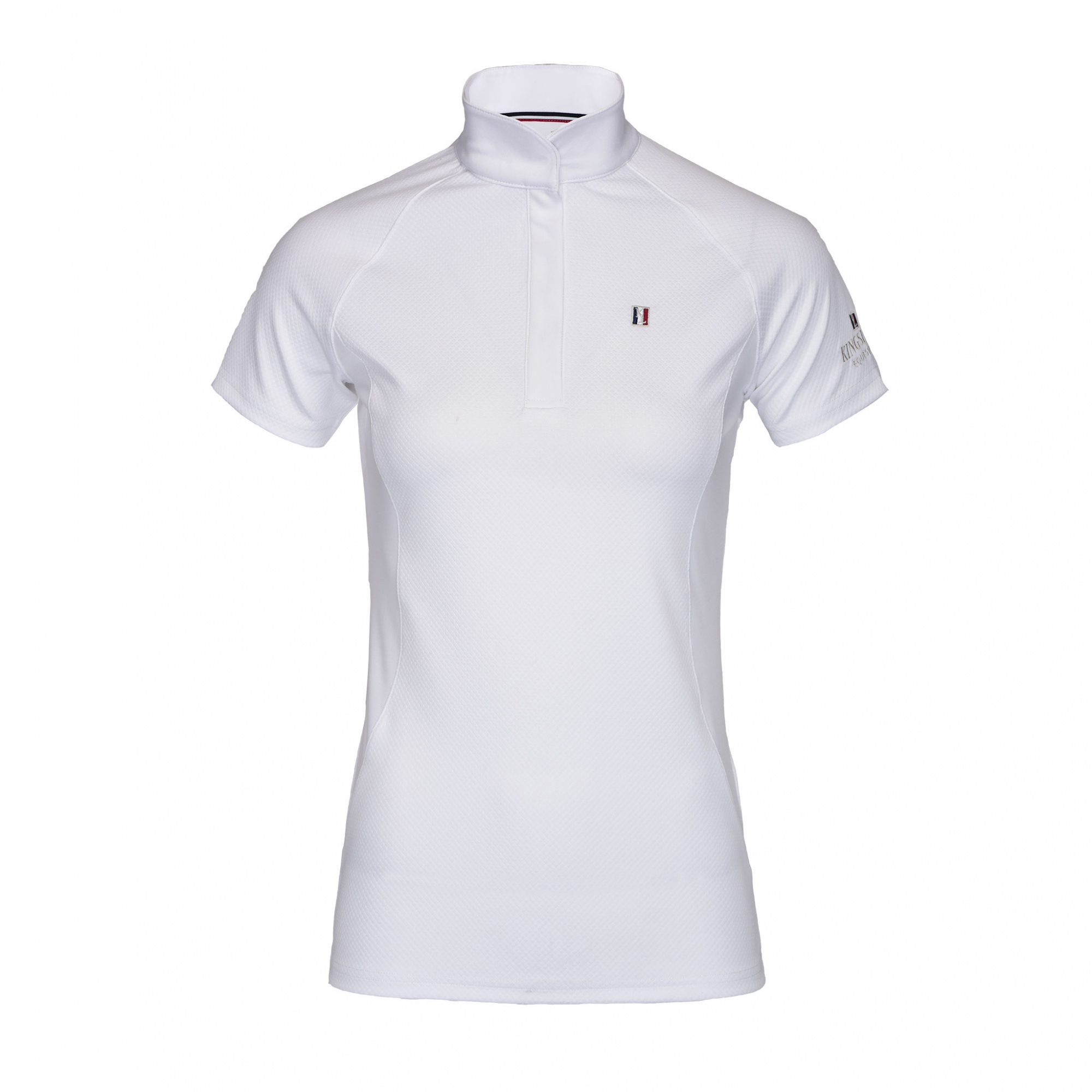 Kingsland női versenypóló a Classic kollekcióból. Kiváló minőségű anyagból készült, amely kifejezetten légáramlást biztosít, rugalmas és nagyon kényelmes a bőr számára. A póló teljes mozgásszabadságot garantál, nagyon elegáns és tökéletes lovas versenyekre a melegebb napokon. Ezen kívül a nyak részem rejtett gombos rögzítéssel van ellátva, valamint állógallérral rendelkezik. Kingsland logóval díszített hímzés található az ujjon és a mellkason.
