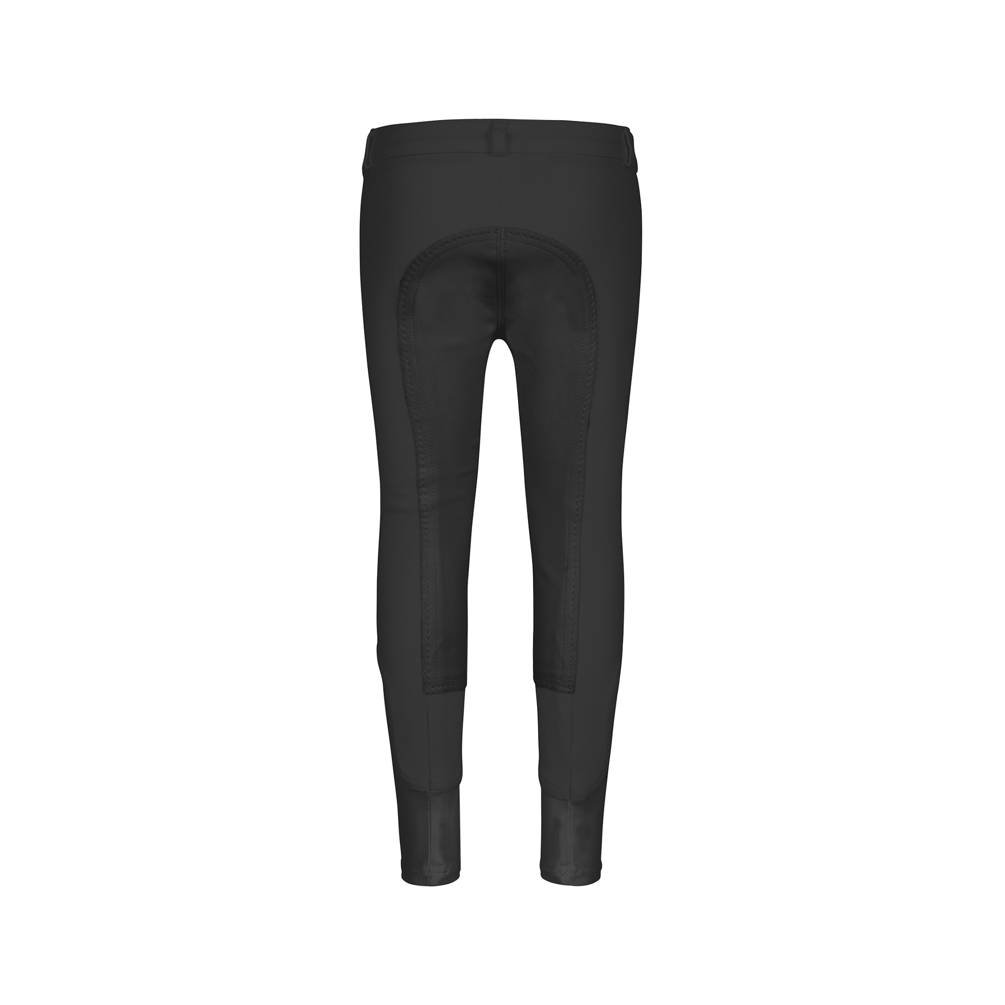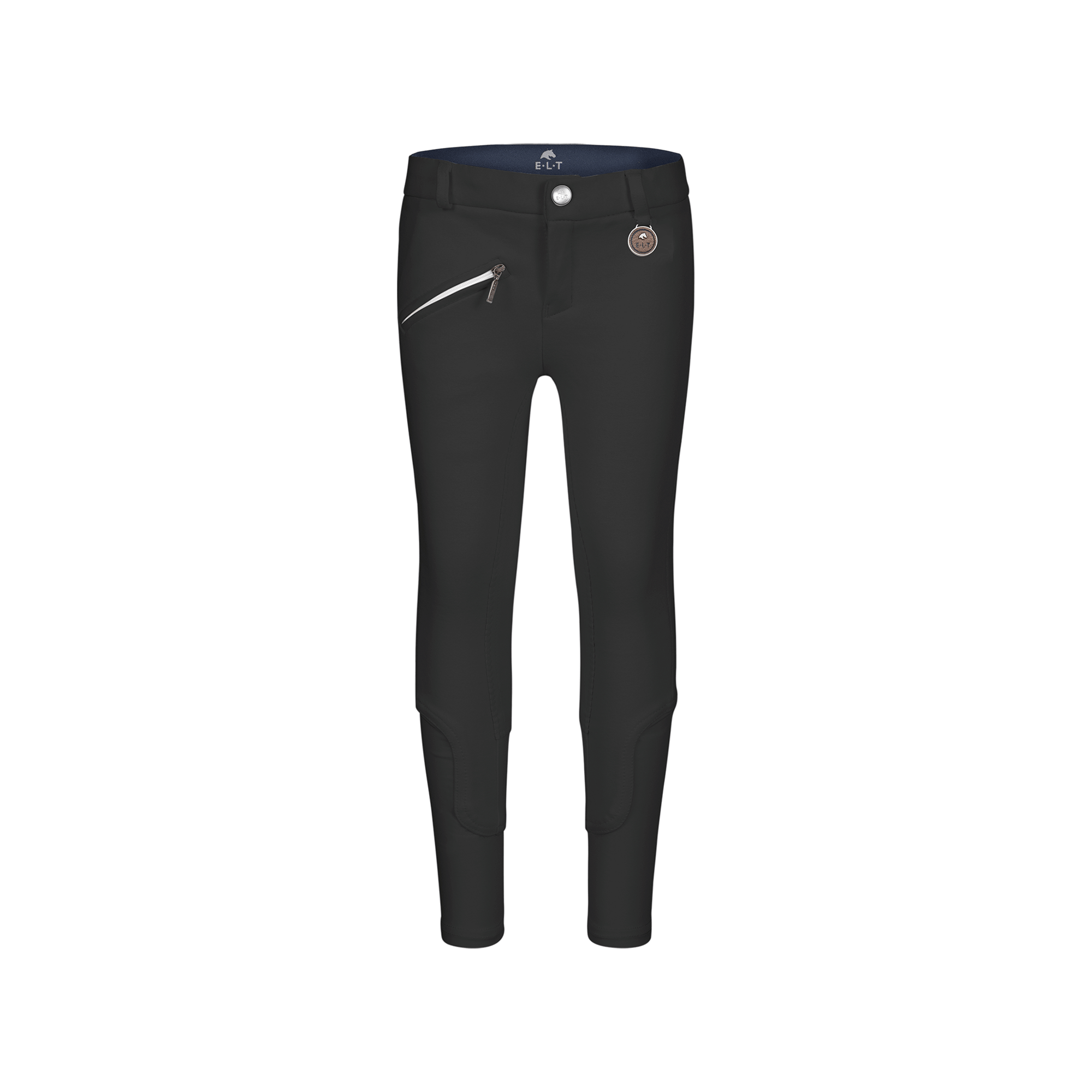 Dziecięce bryczesy do jazdy konnej firmy ELT. Wykonane zostały z bardzo dobrej jakości materiału, który jest mocny i trwały a dodatkowo zapewnia dobrą wentylację, jest elastyczny i przyjemny dla skóry. Posiadają one elastyczne ściągacze na zakończeniu nogawek dla lepszego dopasowania oraz kieszeń z zapięciem na zamek, która znajduje się z przodu. Dekoracyjnie na szlufce od paska dodano mały znaczek, na którym umieszczono logo firmy ELT.