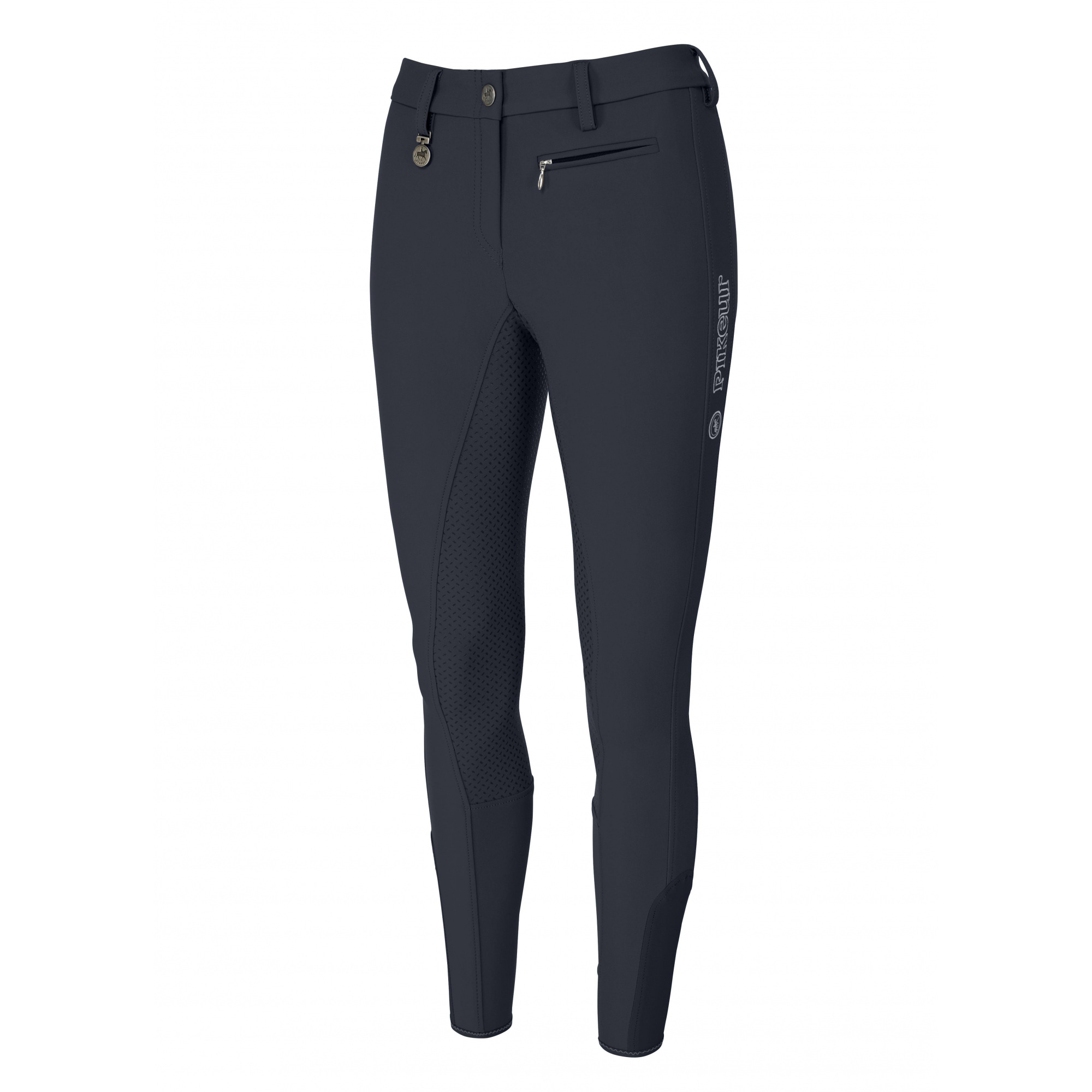 Z lewej storny na nogawce znajduje się ozdoba w postaci logo Pikeur a z prawej strony przy szlufce metalowy znaczek, również z logiem firmy.