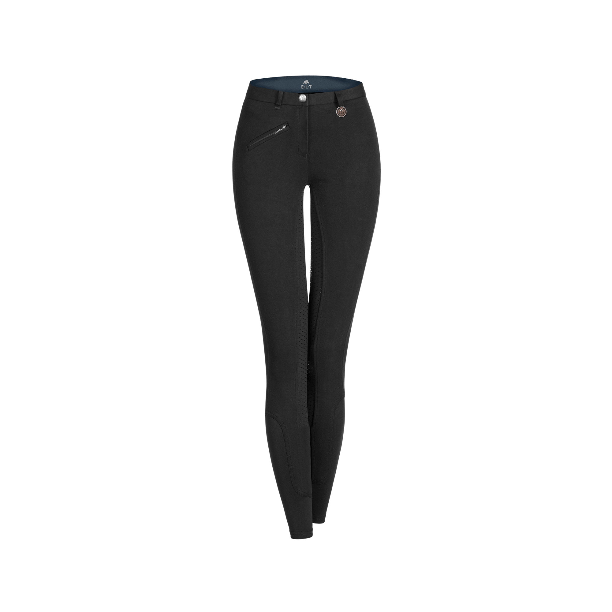 Damskie bryczesy jeździeckie firmy ELT. Zostały wykonane z wysokiej jakości materiału, który charakteryzuje się wysoką przepuszczalnością powietrza, elastycznością a dodatkowo materiał jest przyjazny dla skóry. Zostały wyposażone w kieszeń umieszczoną z przodu z możliwością zapięcia na zamek oraz w szlufki do przełożenia paska. Ponadto w dolnej części dodano ściągacz dla lepszego dopasowania. Dekoracyjnie na szlufce umieszczono plakietkę z logo firmy ELT.