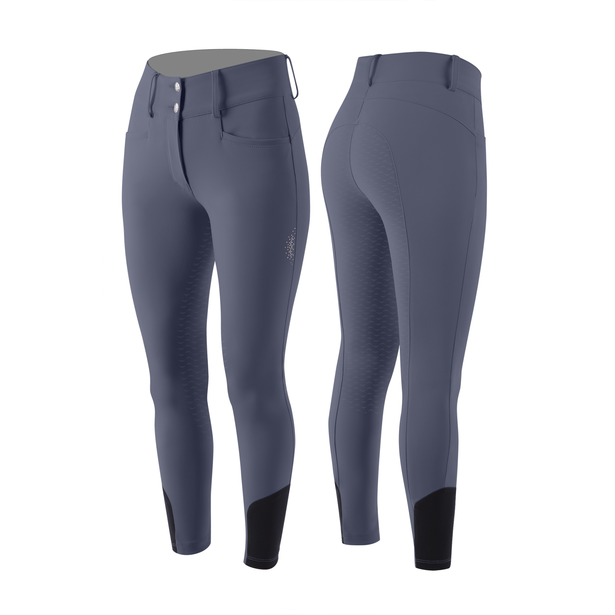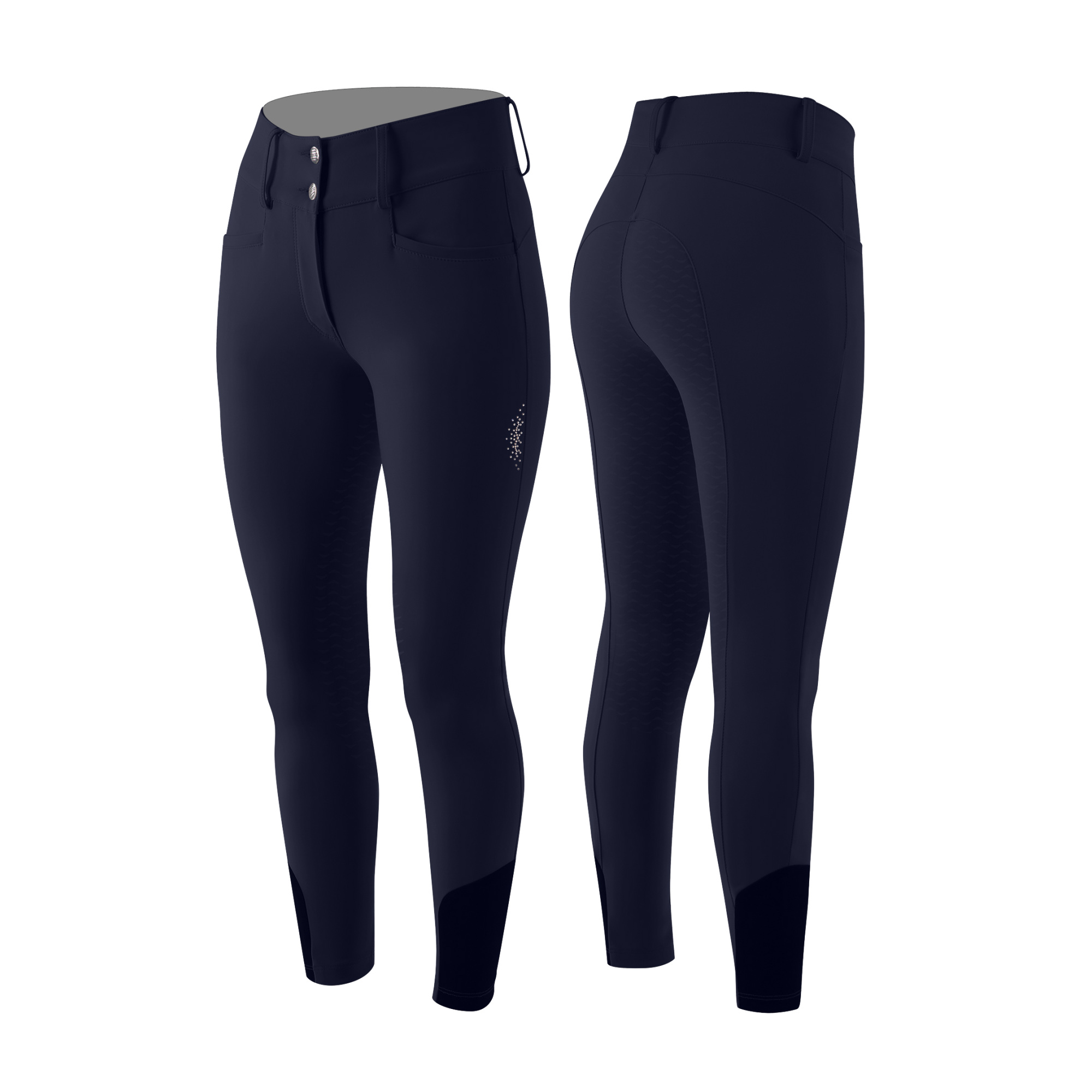 Elastyczny materiał przylega do ciała i podąża za ruchami jeźdźca. Pełny lej silikonowy z technicznego materiału dobrze utrzymuje nogę w siodle. Bryczesy dostępne są w klasycznych, stonowanych kolorach. Wysoki stan oraz modelujący krój podkreślają sylwetkę. Bryczesy nie posiadają zbędnych zdobień, jedynie na nogawce znajduje się logo producenta wyłożone kryształkami.