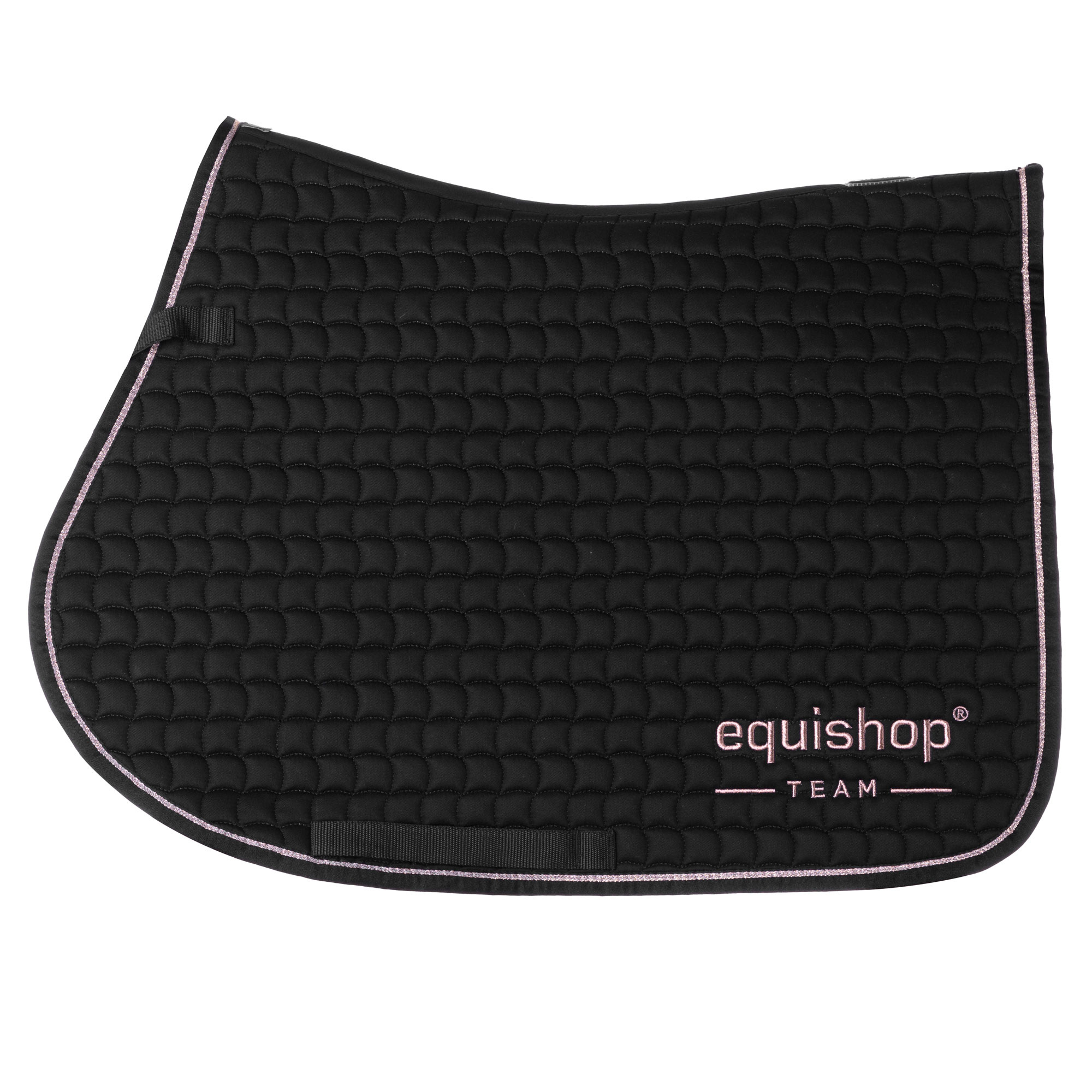 Czaprak jest drobno pikowany, a w rogu czapraka znajduje się wyhaftowane logo Equishop Team. Czaprak posiada wygodne szlufki na popręg oraz rzepy na przystuły.