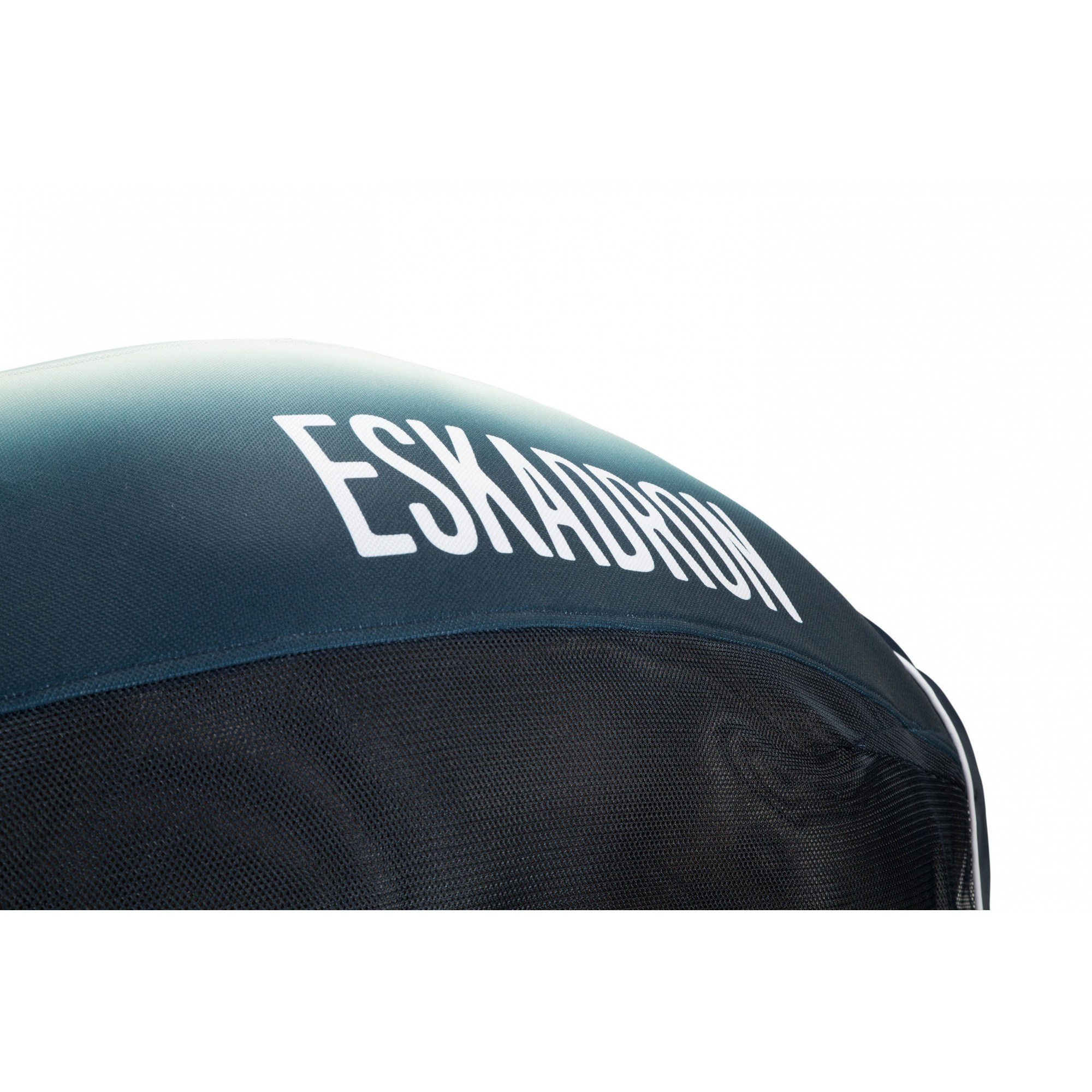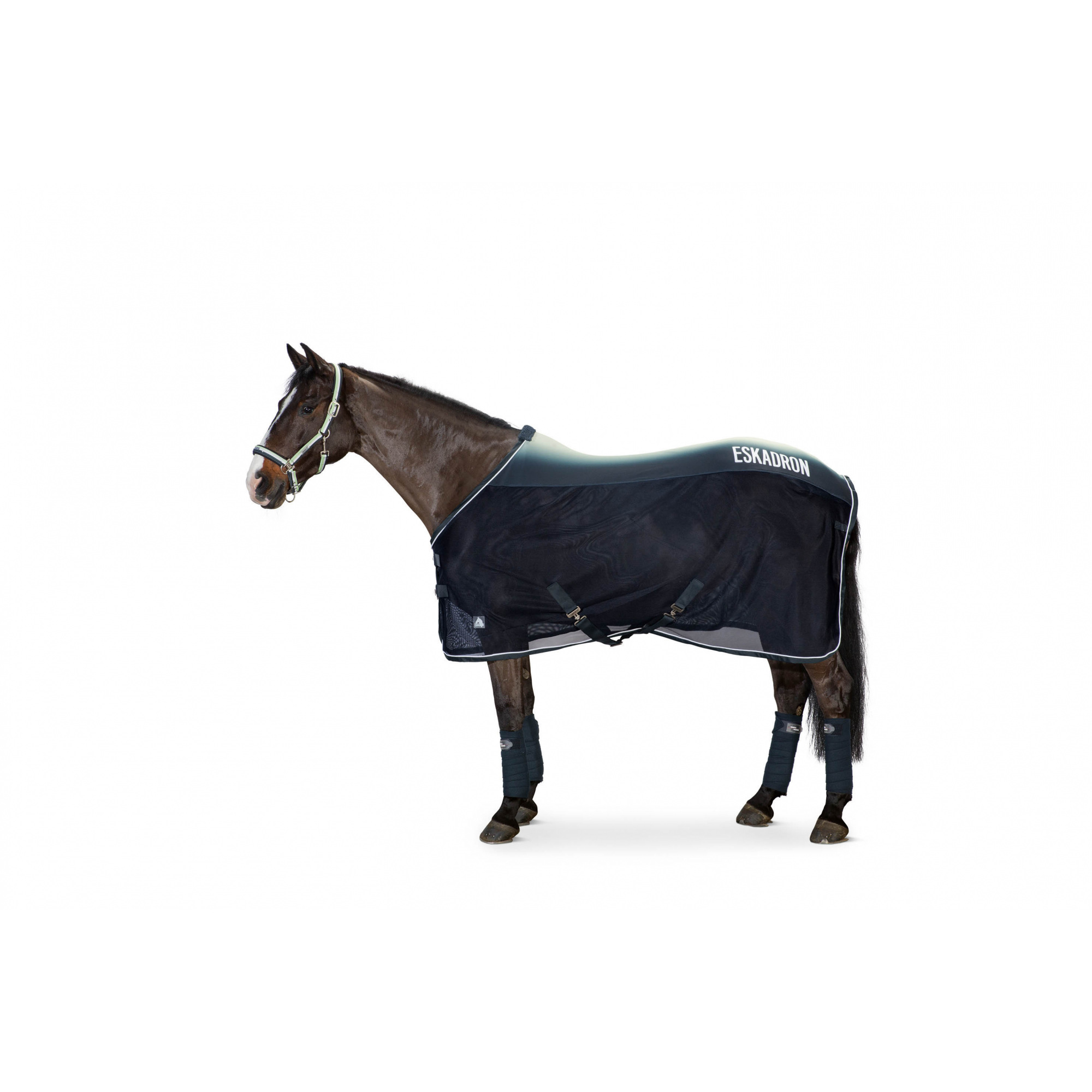 Derka przeciw owadom, uszyta z siateczki poliestrowej. Dzięki temu jest lekka i przewiewna, a przy tym bardzo wytrzymała. Na klatce piersiowej zapięcie na rzep i klamrę, pod brzuchem pasy krzyżowe, a pod ogonem pasek. W okolicy kłębu podszyta futerkiem, co minimalizuje ryzyko obtarcia. Na grzbiecie grubszy, również bardzo przewiewny materiał, Derka ozdobiona napisem Eskadron.
