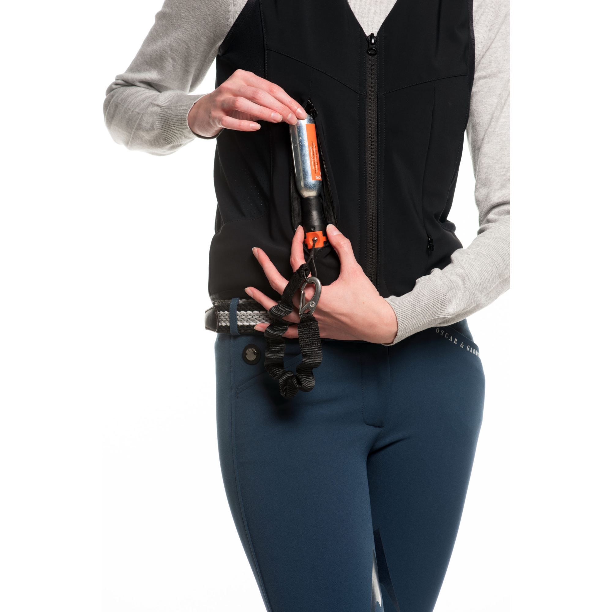 Smyczy do kamizelki Freejump Airbag nie można mocować bezpośrednio do siodła! Należy użyć do tego specjalnego paska mocującego, który odpowiada za skuteczne napompowanie poduszki powietrznej.