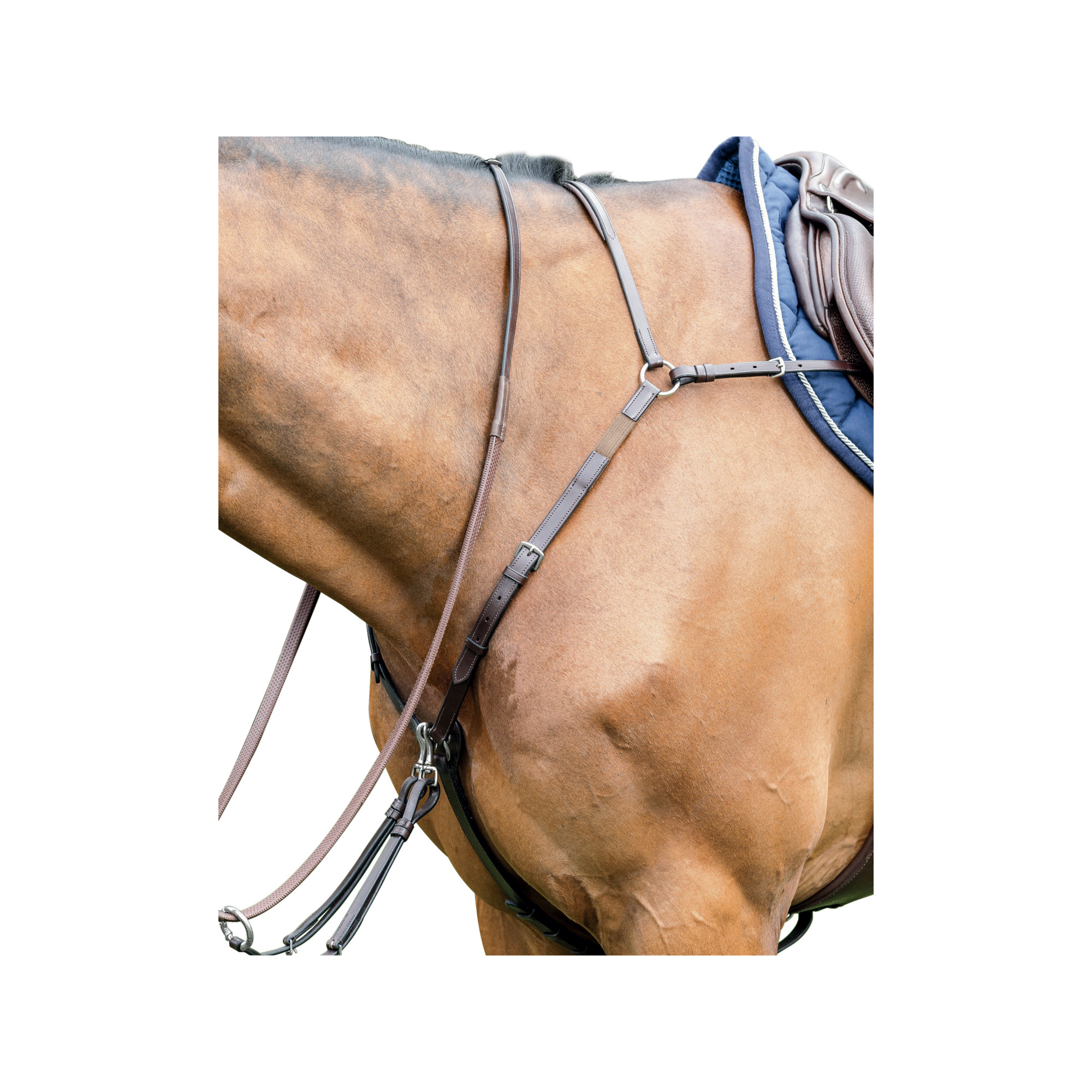 Innowacyjny napierśnik, który został zaopatrzony w elastyczne wstawki, zapewniające doskonale dopasowanie do ciała konia. Mocowanie do przystuł. Napierśnik skutecznie utrzymuje siodło na swoim miejscu, nie krępując przy tym ruchów konia.