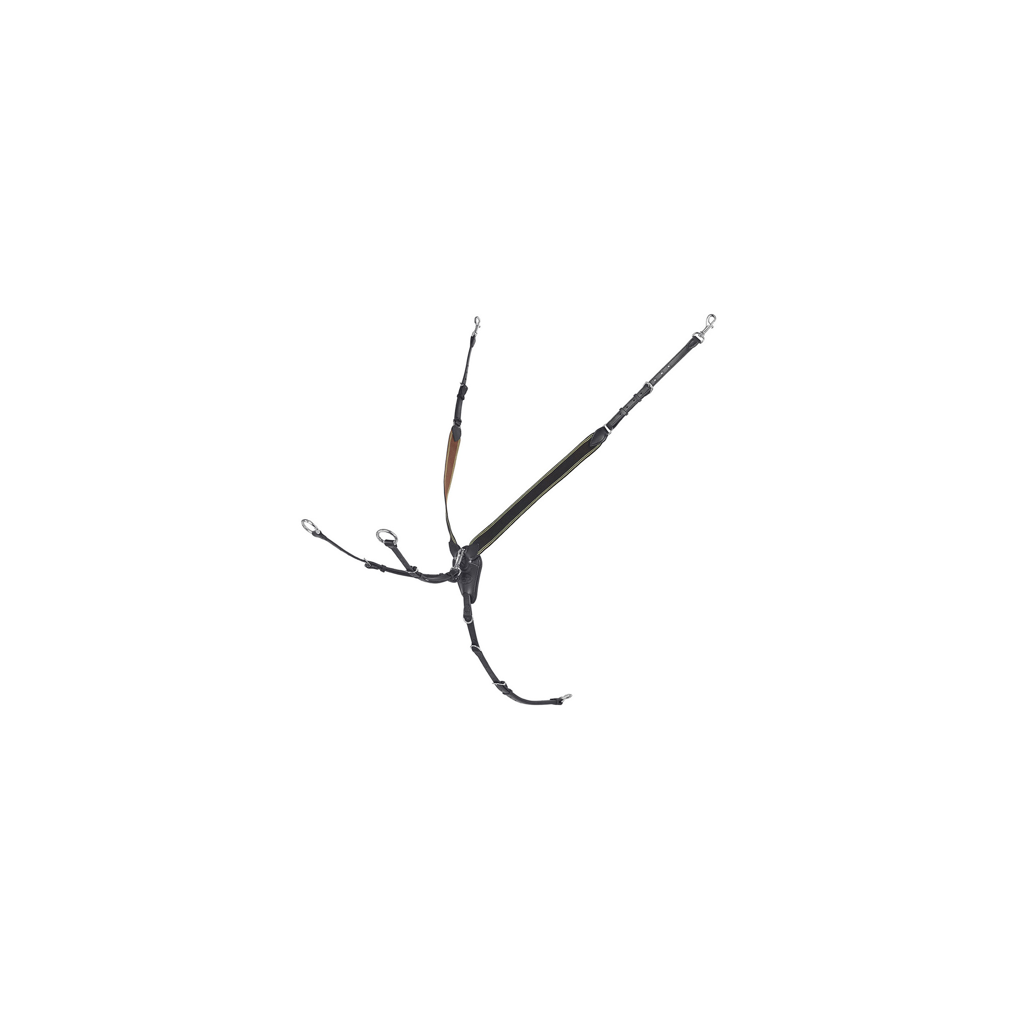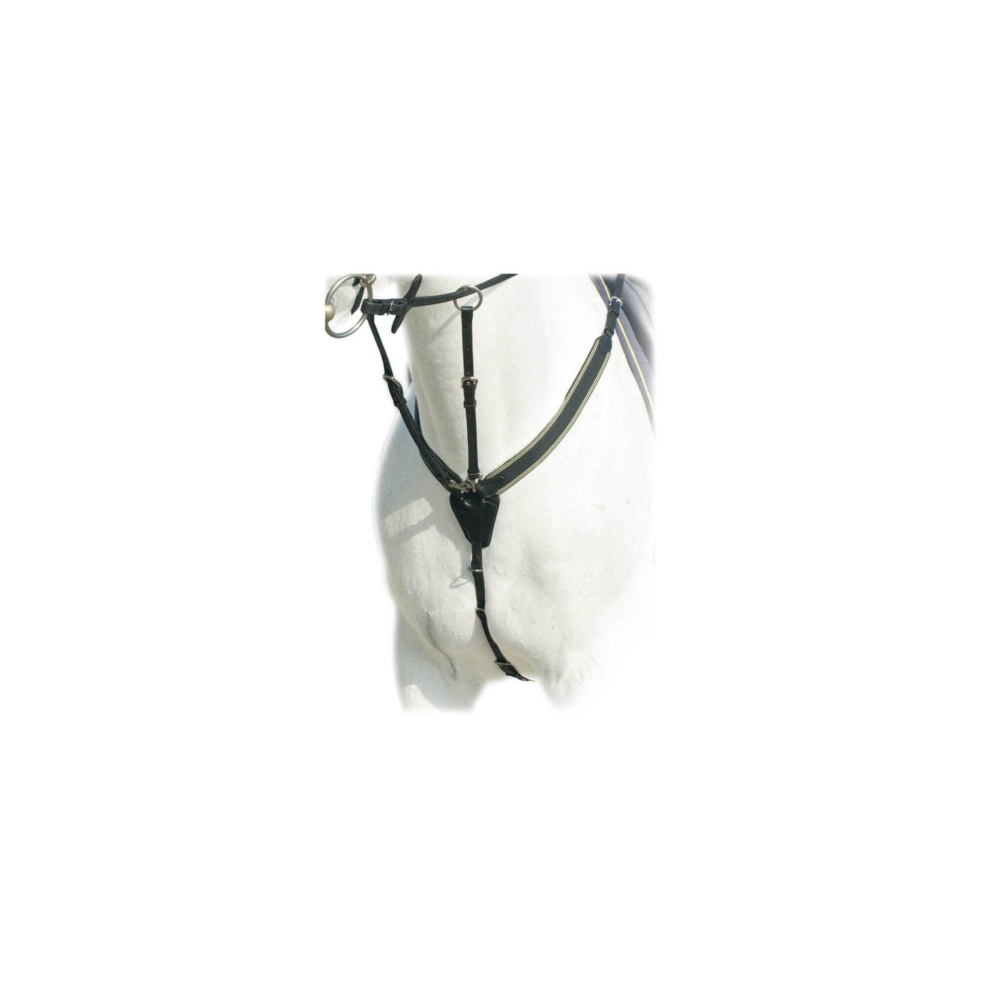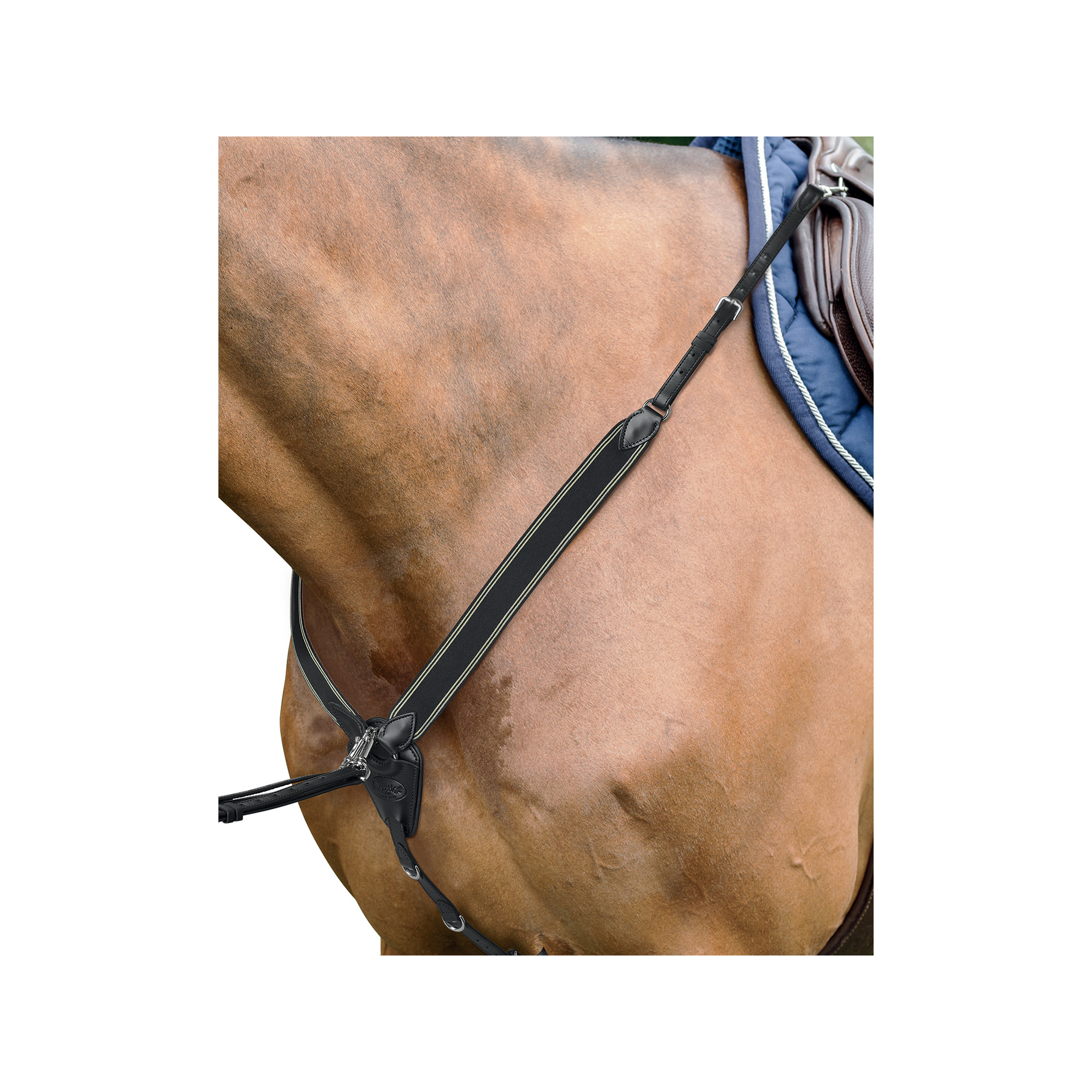 Klasyczny napierśnik skokowy Prestige Italia. Napierśnik zaprojektowany został na bazie połączenia szerokich, elastycznych gum oraz wysokojakościowej skóry naturalnej. Gumowa część napierśnika pozwala na swobodny i nieskrępowany ruch konia. Skórzane części zostały odpowiednio zaimpregnowane, tak aby zapobiegać wchłanianiu potu i jego negatywnemu działaniu. Napierśnik dopinany jest do siodła za pomocą wygodnych w użyciu sprzączek oraz skózanej pętli dopinanej do popręgu. Napierśnik posiada regulację długości, pozwalając na idealne jego dopasowanie do budowy konia.