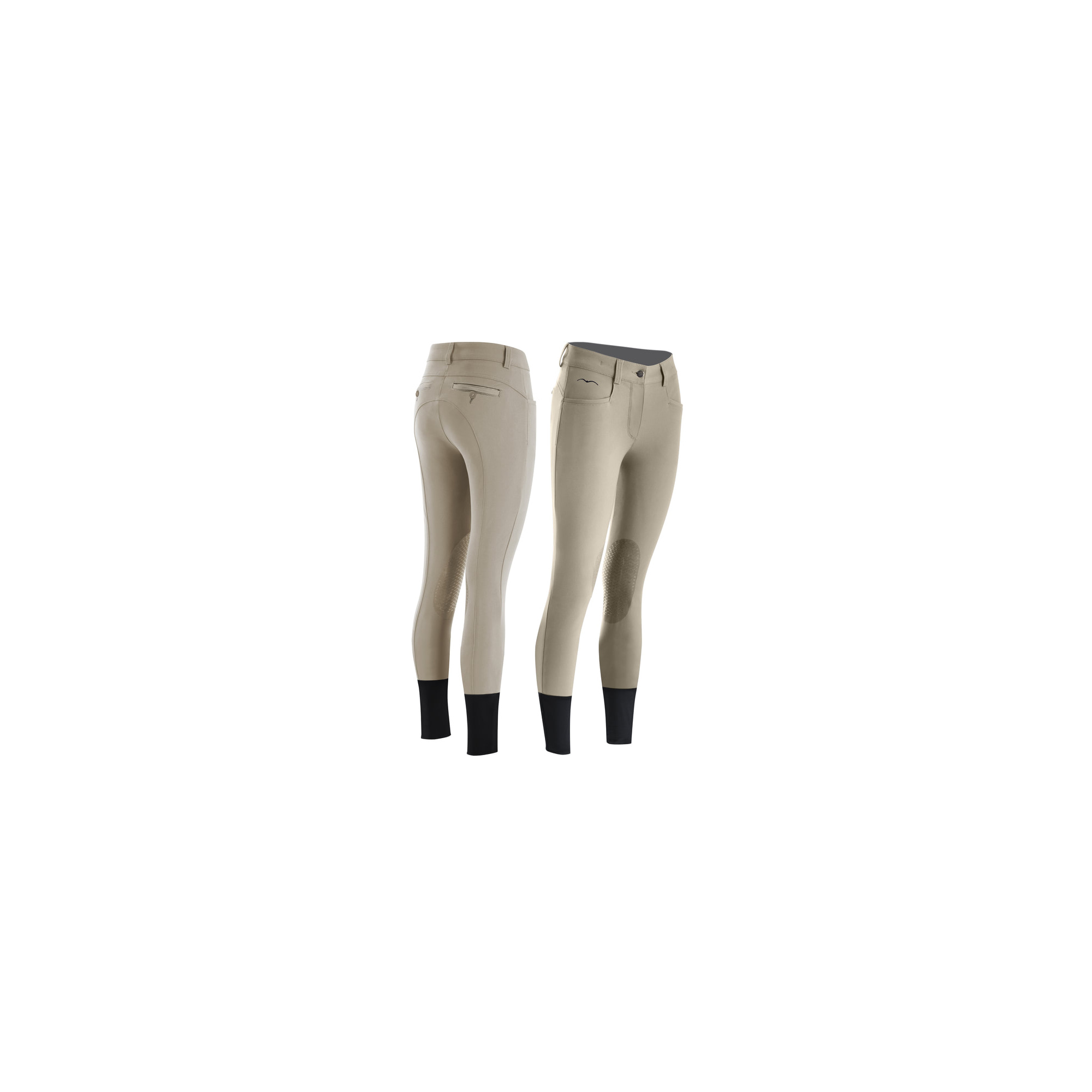 Damskie bryczesy jeździeckie firmy Animo. Wykonane zostały z bardzo dobrej jakości materiału, który jest elastyczny, oddychający oraz przyjemny dla skóry jeźdźca. Zostały wyposażone w lej silikonowy, w dwie kieszenie umieszczone w górnej części oraz w dwie kieszenie z tyłu z zapięciem na guzik. Na zakończeniu nogawek znajdują się elastyczne ściągacze dla lepszego dopasowania. Dekoracyjnie nad kieszenią dodano mały haft z logo firmy Animo.
