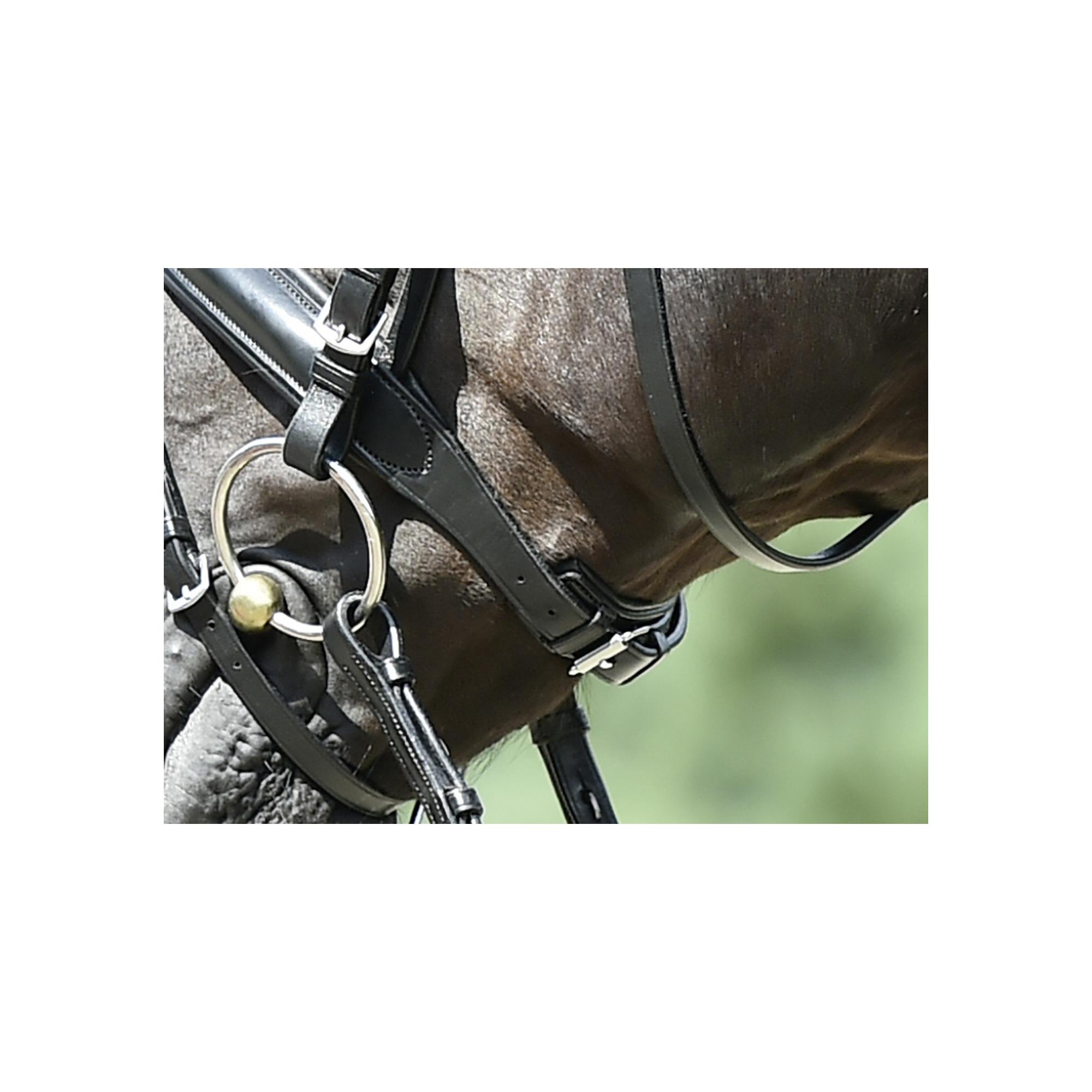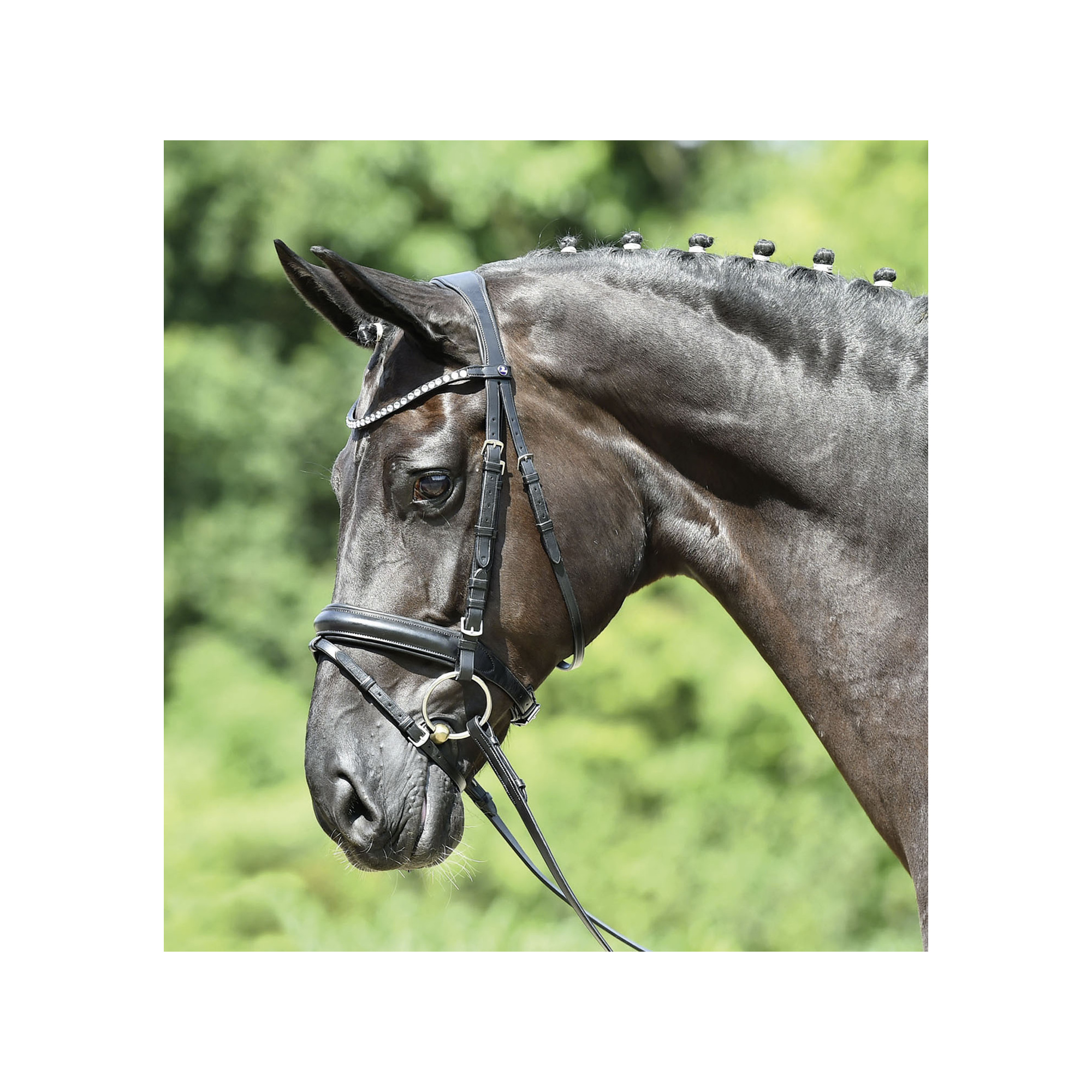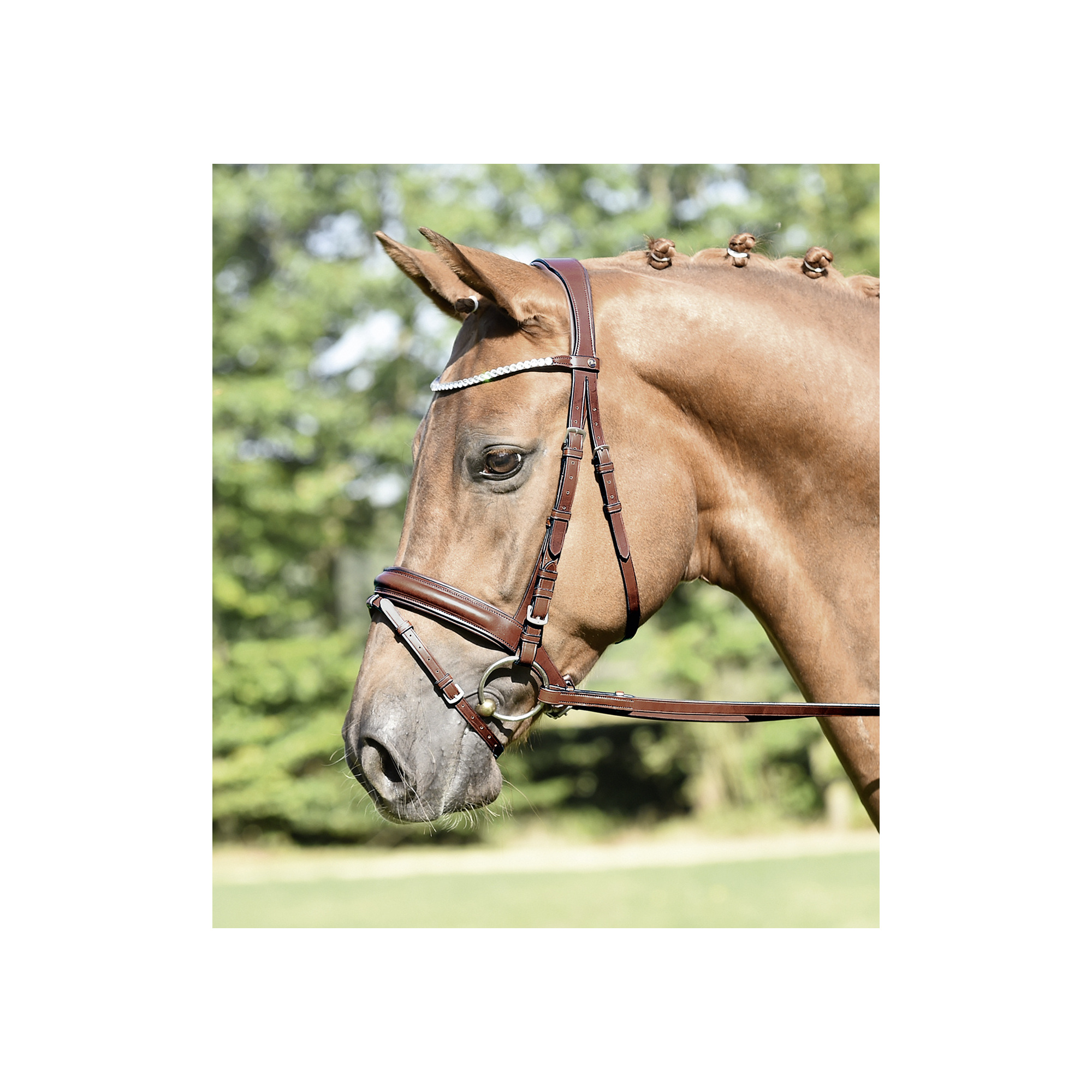 Ogłowie wykonane z najlepszej włoskiej skóry uzdowej pro nature - garbowana roślinnie. Pasek potyliczny o anatomicznym kształcie, miękko podszyty, dzięki czemu równomiernie rozkłada nacisk. Podgardle i paski nachrapnika regulowane obustronnie. Ogłowie posiada angielski nachrapnik, również miękko podszyty. Elegancki naczółek opadający, ozdobiony błyszczącymi kryształkami. Okucia ze stali szlachetnej. Sprzedawane bez wodzy.