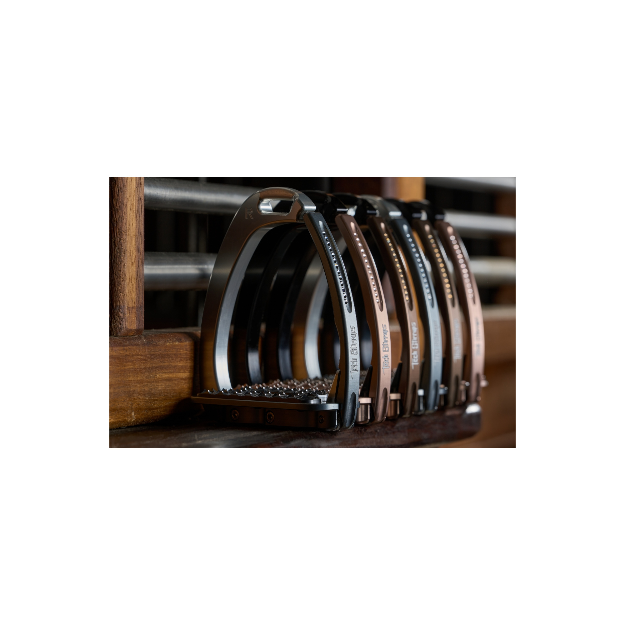 Model Venice Plus EVO Swarovski to ekskluzywna wersja innowacyjnych strzemion jeździeckich, łącząca zaawansowane technologie z wyjątkowym designem. Dzięki subtelnym kryształkom Swarovskiego umieszczonym na bocznym ramieniu, strzemiona te nie tylko zapewniają niezrównane bezpieczeństwo i wygodę, ale także przyciągają wzrok eleganckim wykończeniem.