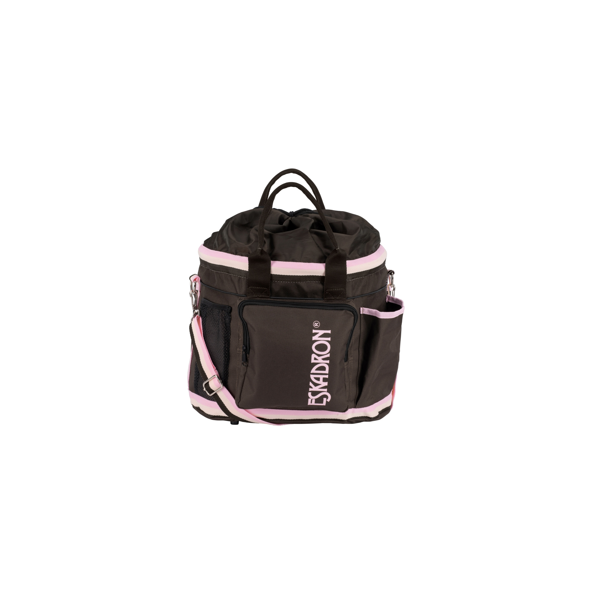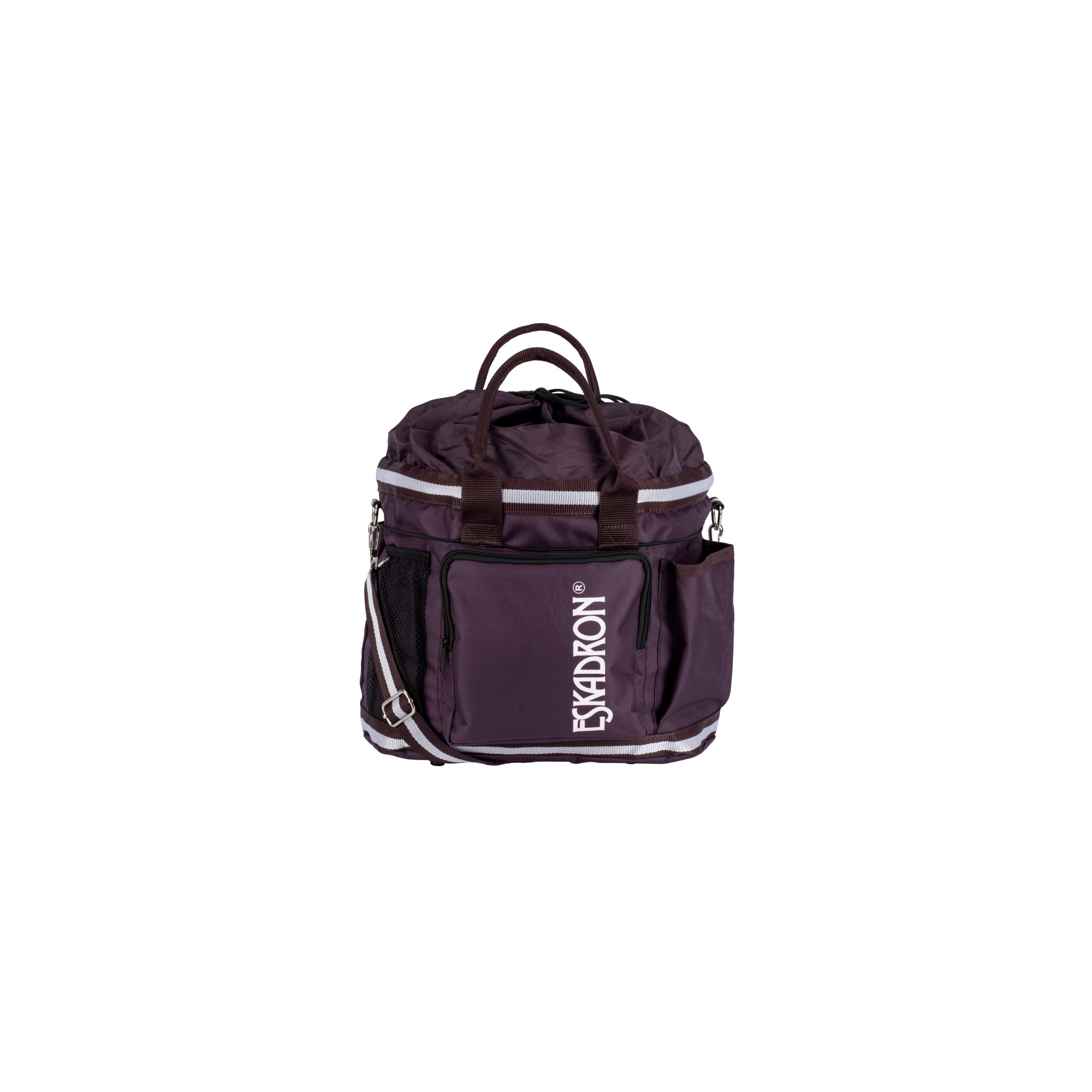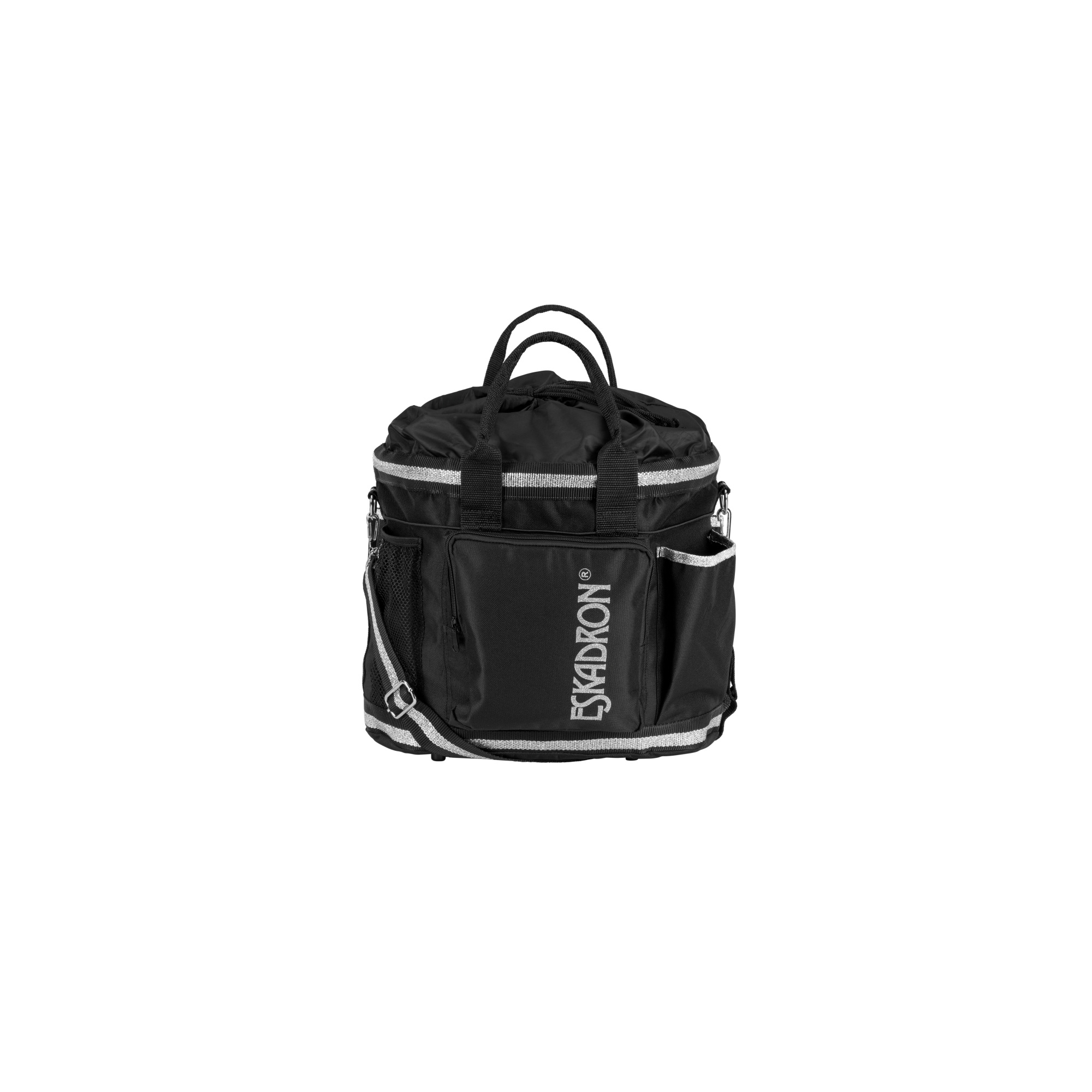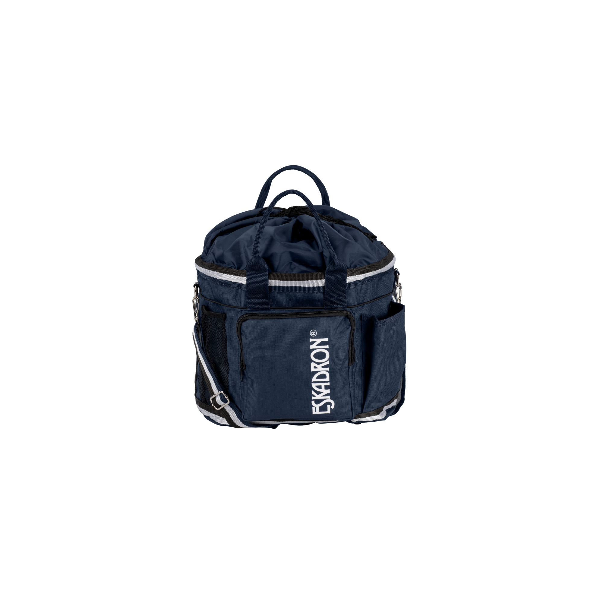Torba na akcesoria wykonana została z mocnej tkaniny. Bardzo przydatna w stajni jak również na zawodach. Bardzo pojemna posiada wiele kieszonek wewnątrz oraz na zewnątrz. Dno torby zostało usztywnione dzięki czemu torba jest stabilniejsza. Zamykana na zaciągany sznurek. Wyposażona w dwa uchwyty do noszenia w ręce, a także jeden regulowany pas na ramię. Na jednej z zewętrznych kieszeni najduje się logo firmy Eskadron. Dostępna jest w kilku wariantach kolorystycznych.